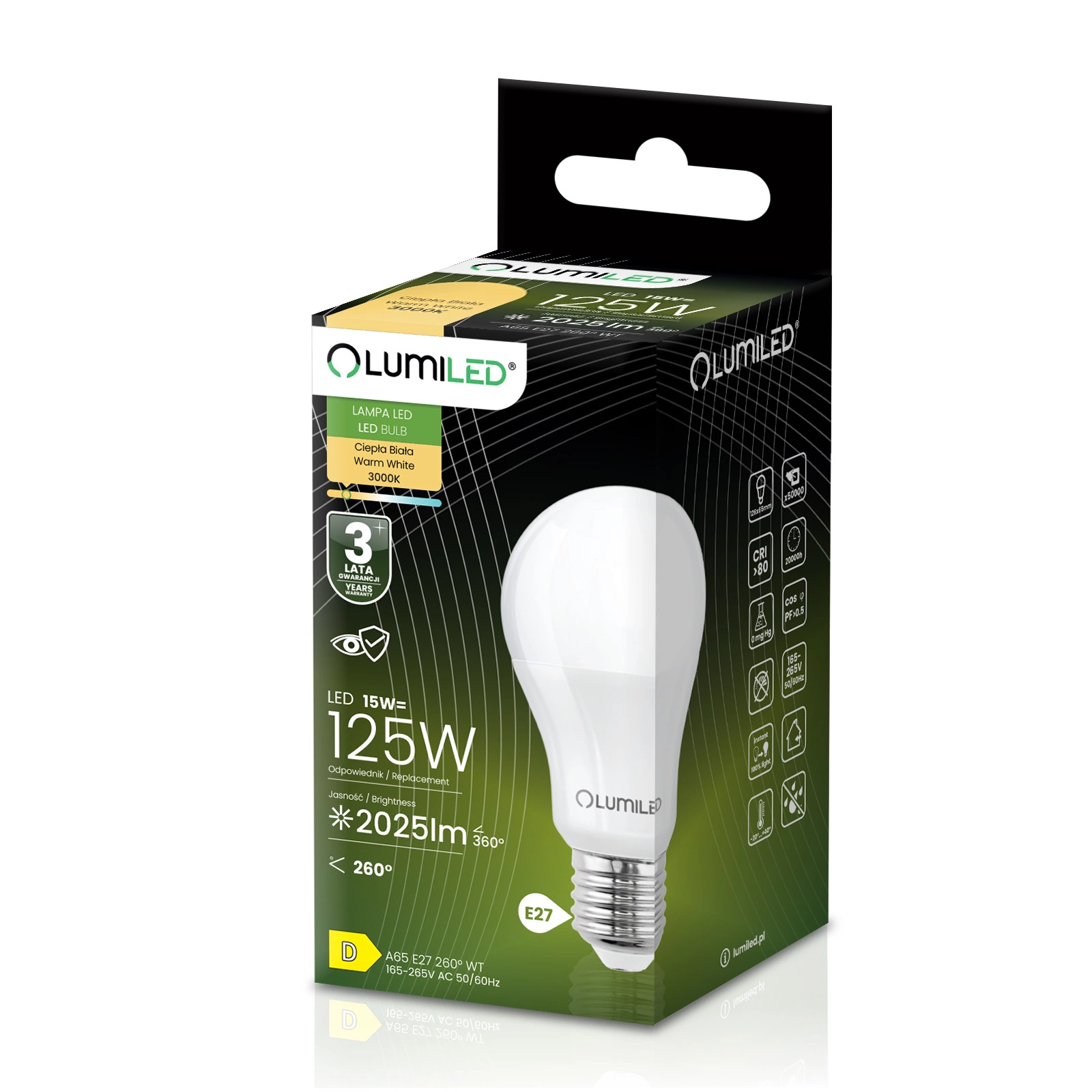 Die LED-Glühbirne der renommierten Marke LUMILED mit E27-Sockel und 15W ist ein hervorragender Ersatz für herkömmliche 120W-Glühbirnen und bietet Energieeinsparungen und eine längere Lebensdauer. Sie emittiert Licht mit einem Lichtstrom von 1.952 Lumen und einer neutralen Farbe von 4000K und ist damit ideal für die Innenbeleuchtung, wo eine helle und natürliche Lichtfarbe gewünscht wird. Der Abstrahlwinkel von 260° ermöglicht eine breite Lichtstreuung, die den Raum effektiv ausleuchtet. Dank ihrer hochwertigen Verarbeitung hat sie eine Lebensdauer von bis zu 15.000 Stunden, was einer langjährigen Nutzung entspricht. Außerdem arbeitet sie in einem weiten Spannungsbereich von 165-265 V und ist für den Einsatz bei Umgebungstemperaturen von -20°C bis +40°C geeignet. Eine ideale Wahl für alle, die Wert auf Energieeinsparung und Umweltschutz legen.