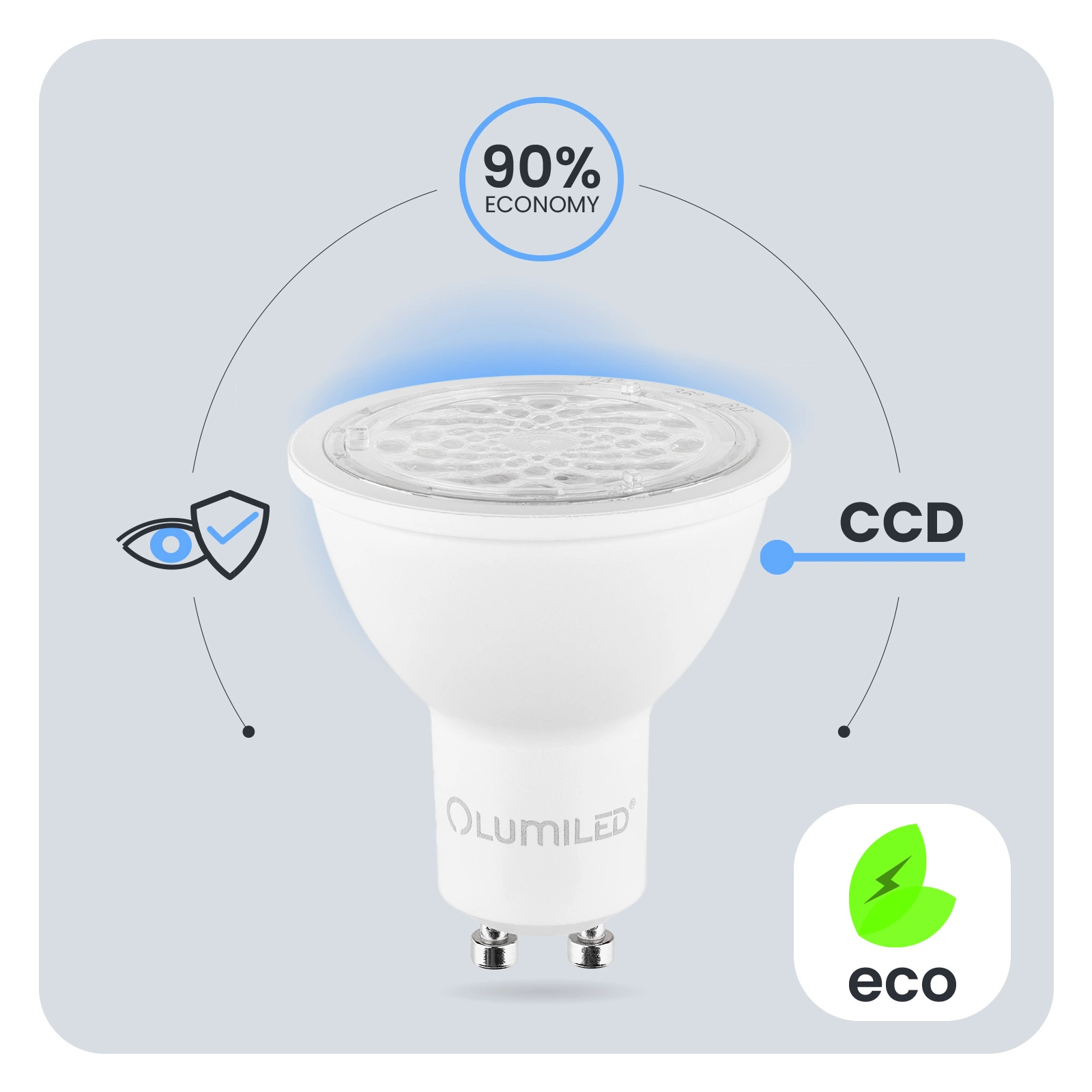 Der in der LED-Glühbirne verwendete CCD-Inverter macht die Glühbirne widerstandsfähig gegen Einbrüche und Spitzen in der Netzspannung. Das Licht flackert und zittert nicht. Der CCD-Konverter sorgt dafür, dass die Glühbirne über einen langen Zeitraum hinweg einwandfrei funktioniert. Bei der Entwicklung der LUMILED-Glühbirnen wurde an den Benutzer gedacht. Eine schlechte Beleuchtungsqualität kann zur Ermüdung der Augen führen. Deshalb verfügen unsere Lampen über die technische Entwicklung Eye Safe, um in jedem Raum eine angenehme und augenfreundliche Beleuchtung zu gewährleisten.