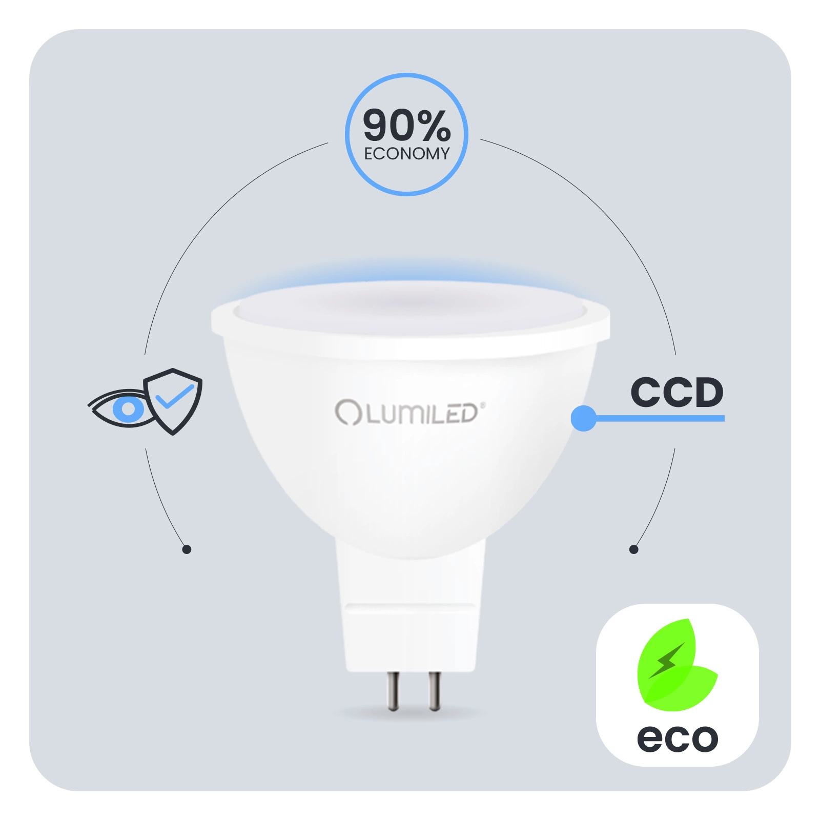 Der in der LED-Glühbirne verwendete CCD-Inverter macht die Glühbirne widerstandsfähig gegen Einbrüche und Spitzen in der Netzspannung. Das Licht flackert und zittert nicht. Der CCD-Konverter sorgt dafür, dass die Glühbirne über einen langen Zeitraum hinweg einwandfrei funktioniert. Bei der Entwicklung der LUMILED-Glühbirnen wurde an den Benutzer gedacht. Eine schlechte Beleuchtungsqualität kann zur Ermüdung der Augen führen. Deshalb verfügen unsere Lampen über die technische Entwicklung Eye Safe, um in jedem Raum eine angenehme und augenfreundliche Beleuchtung zu gewährleisten.