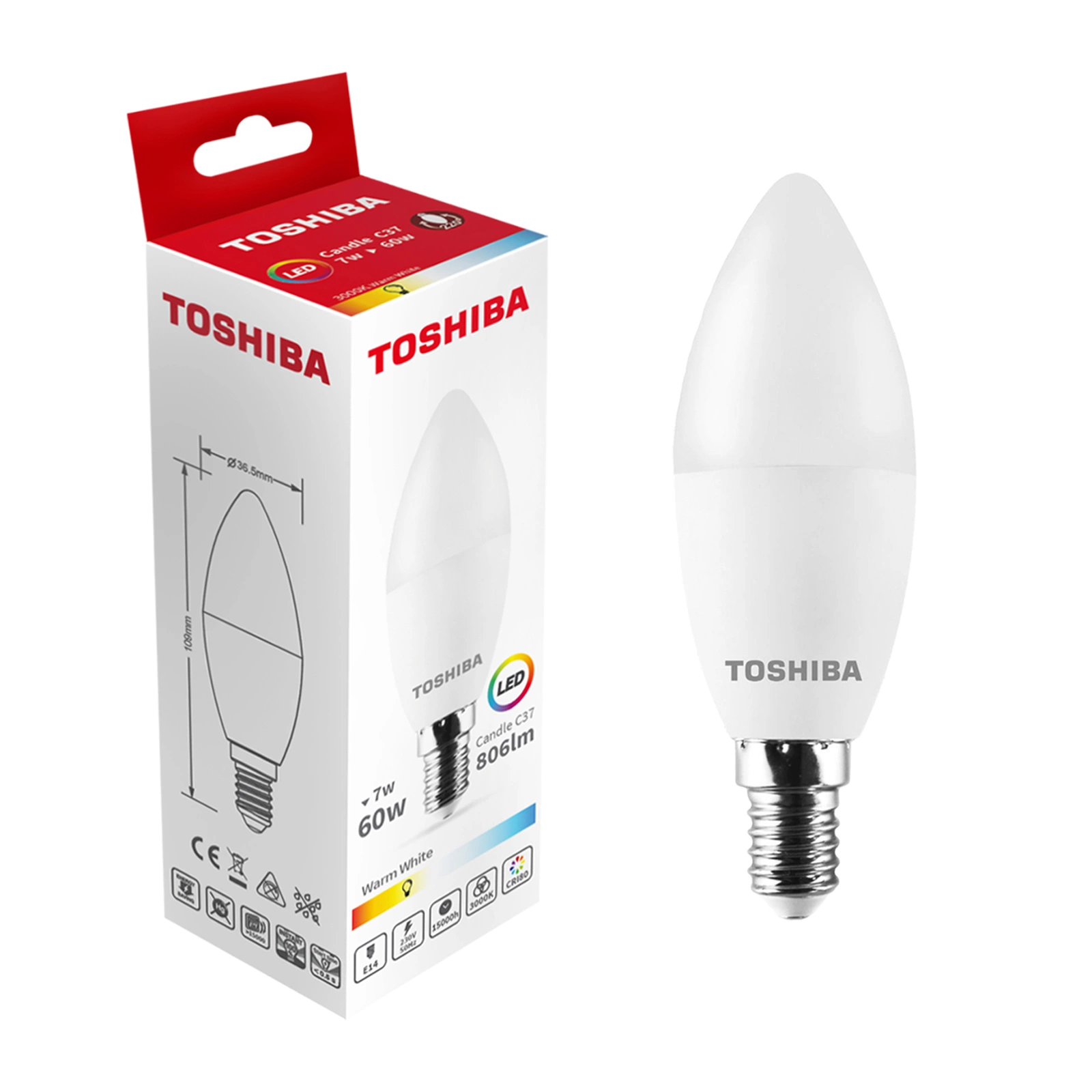 LED-Glühbirne der renommierten und anerkannten Marke TOSHIBA mit E14-Sockel, 7 W Leistung und warmer Lichtfarbe. Die Glühbirne eignet sich perfekt für jeden Haushalt, jedes Geschäft, jedes Hotel oder Restaurant als Akzent- oder Dekorationsbeleuchtung und kann in alle Leuchten mit E14-Sockel eingebaut werden .