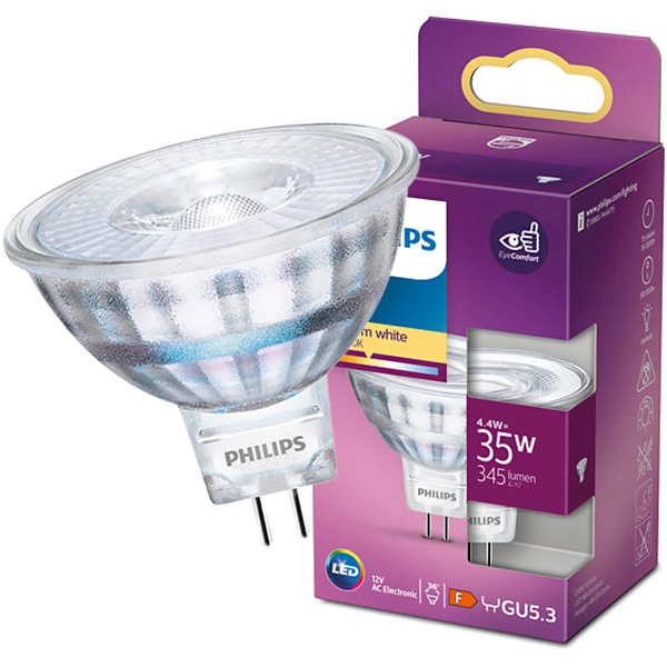 LED-Lampe des renommierten und anerkannten Unternehmens PHILIPS in der Beleuchtungsbranche mit einem MR16- Sockel und einer Leistung von 4,4 W. Die Farbtemperatur beträgt 2700 K , wodurch Sie eine warme, ruhige Atmosphäre schaffen können, die zum Entspannen einlädt. Licht mit einer Farbtemperatur von 2700K eignet sich auch ideal zur Beleuchtung von Häusern. Dieser moderne LED-Strahler mit schöner Form und bekannten Abmessungen ist ein perfekter, umweltfreundlicher Ersatz für herkömmliche Halogenstrahler.