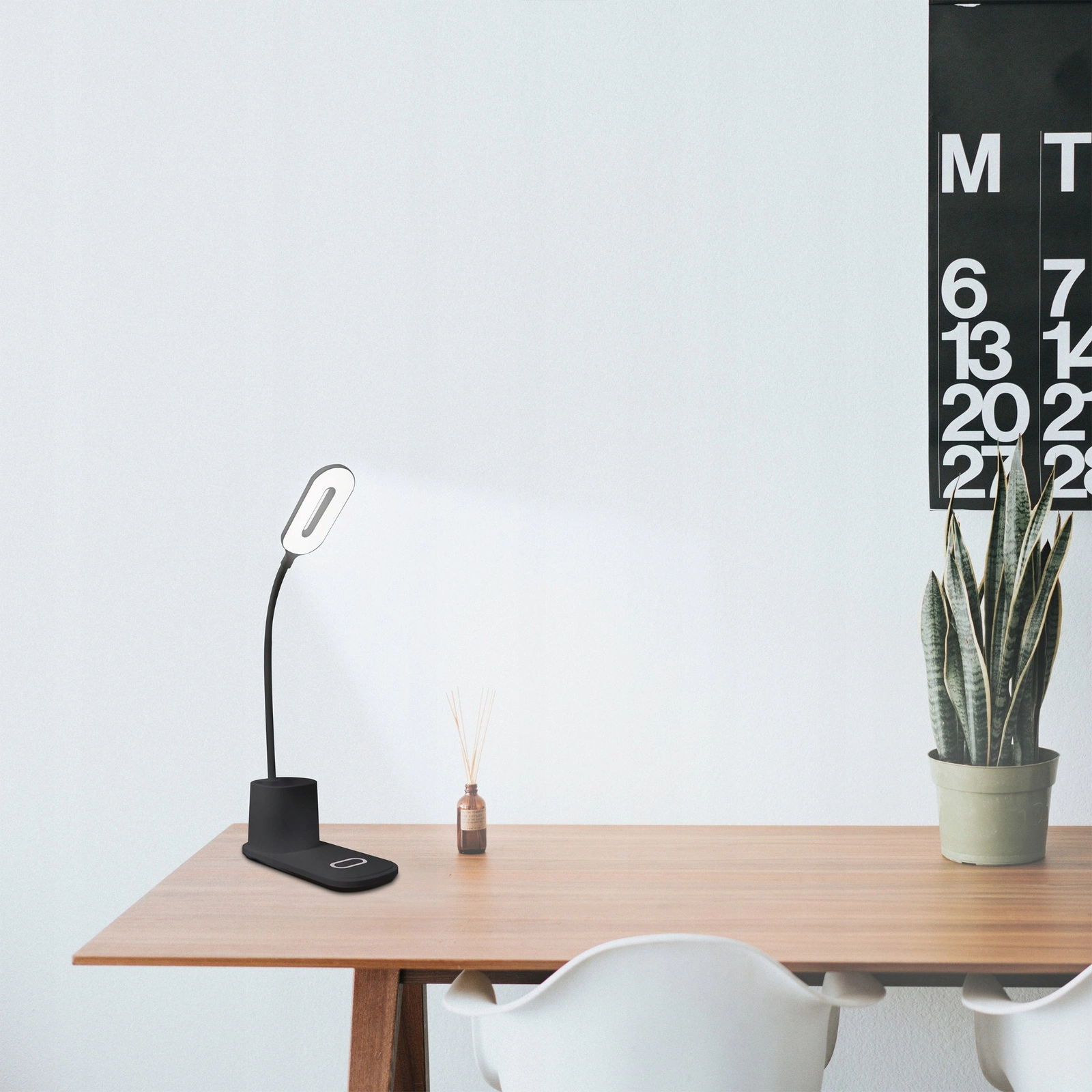 Flexible schwarze LED-Schreibtischlampe mit QI- Induktionsladefunktion . Die Lampe verfügt über einen flexiblen Hals , mit dem Sie die Höhe und den Winkel des LICHTS frei einstellen können. Die Lampe besteht aus hochwertigem Kunststoff (ABS). Die Schreibtischleuchte ist mit einer integrierten LED-LICHTquelle mit einer Leistung von 3 W und einem Lichtstrom von 350 lm ausgestattet . Die Lampe verfügt über drei Beleuchtungsmodi: warme Farbe, kalte Farbe, gedimmte warme Farbe.