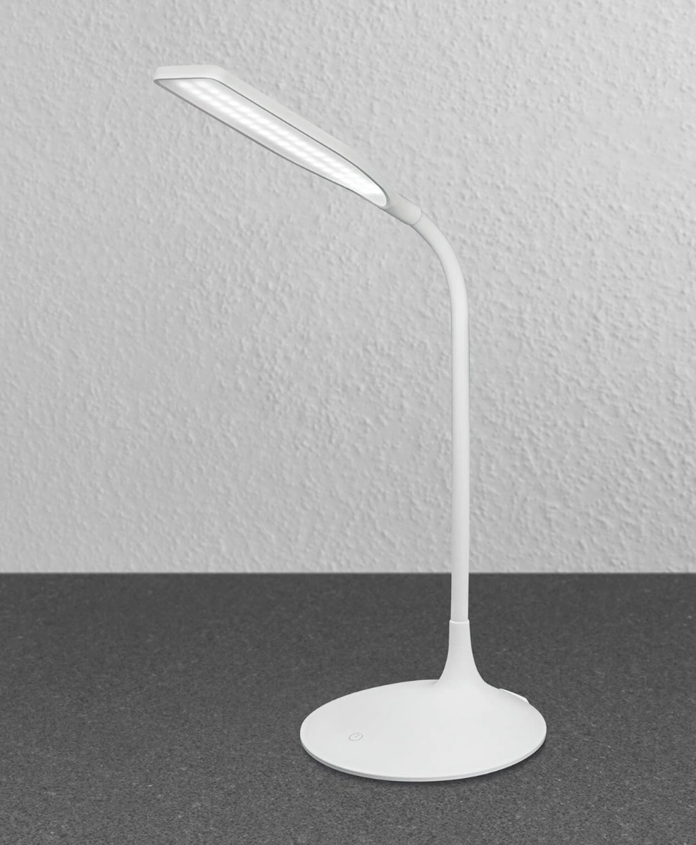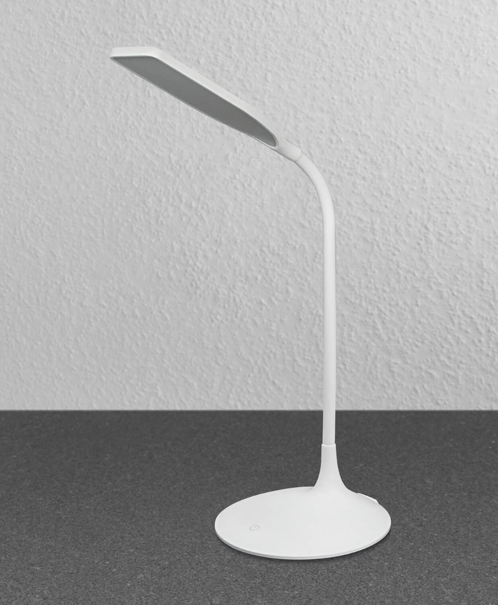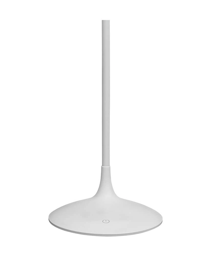Die Leuchte ist aus robustem ABS-Material in Weiß gefertigt und kann dank der Befestigungsmethode auf einem Schreibtisch platziert werden. Sie verfügt über eine integrierte LED-Quelle und wird mit Lithium-Ionen-Akkus betrieben, was sie mobil und bequem einsetzbar macht. Eine Dimmfunktion und ein Lichtverteilungswinkel von 105° ermöglichen eine individuelle Einstellung der Helligkeit. Die Lampe entspricht den CE-Normen, hat eine Lebensdauer von 30000 Stunden und die Schutzart IP20 sorgt für Sicherheit im Gebrauch.