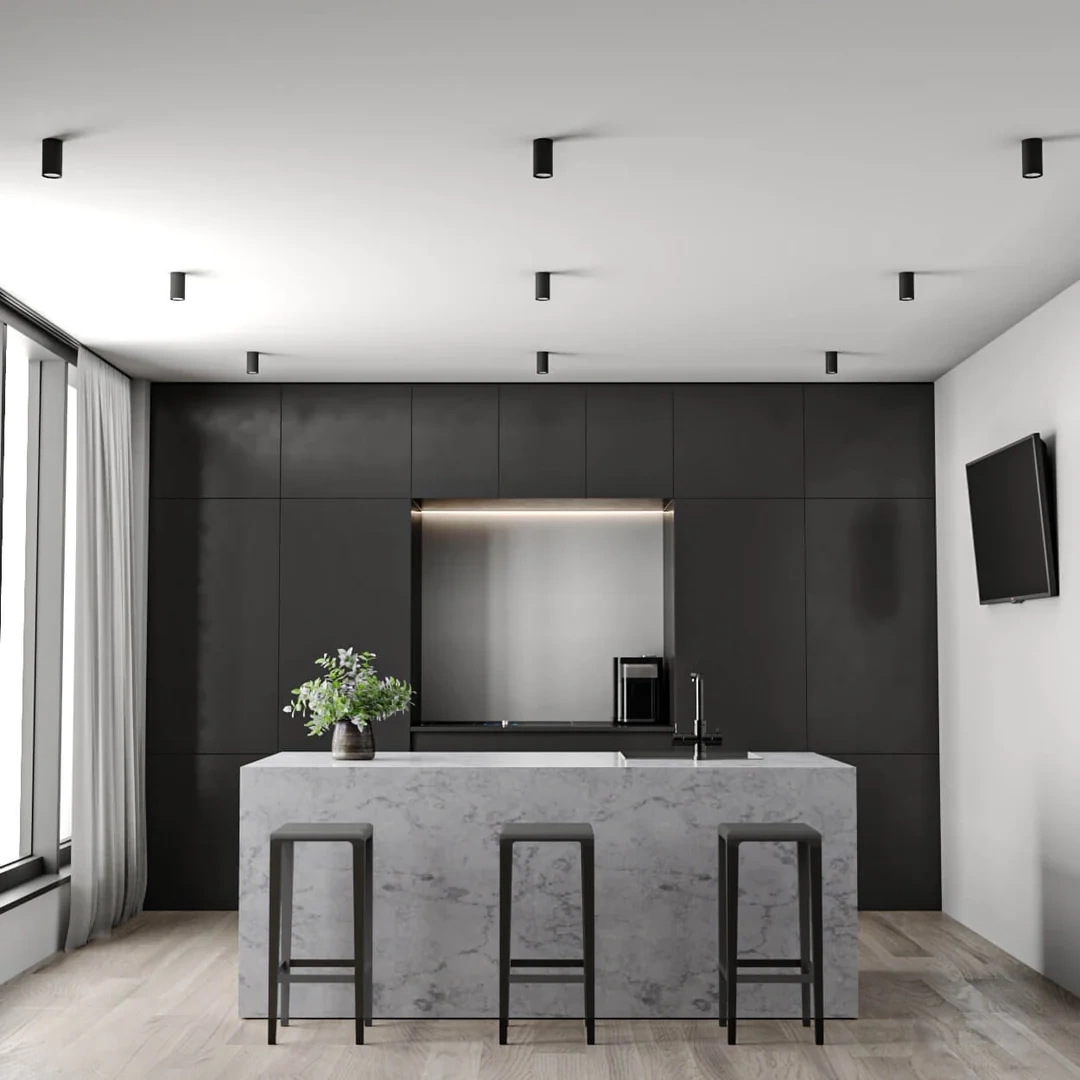 Eine an zentraler Stelle montierte Halogenleuchte ist eine ansprechende Dekoration und eine perfekte Ergänzung zu modernen oder minimalistischen Innenräumen, indem sie Charme verleiht und deren Aussehen verändert.