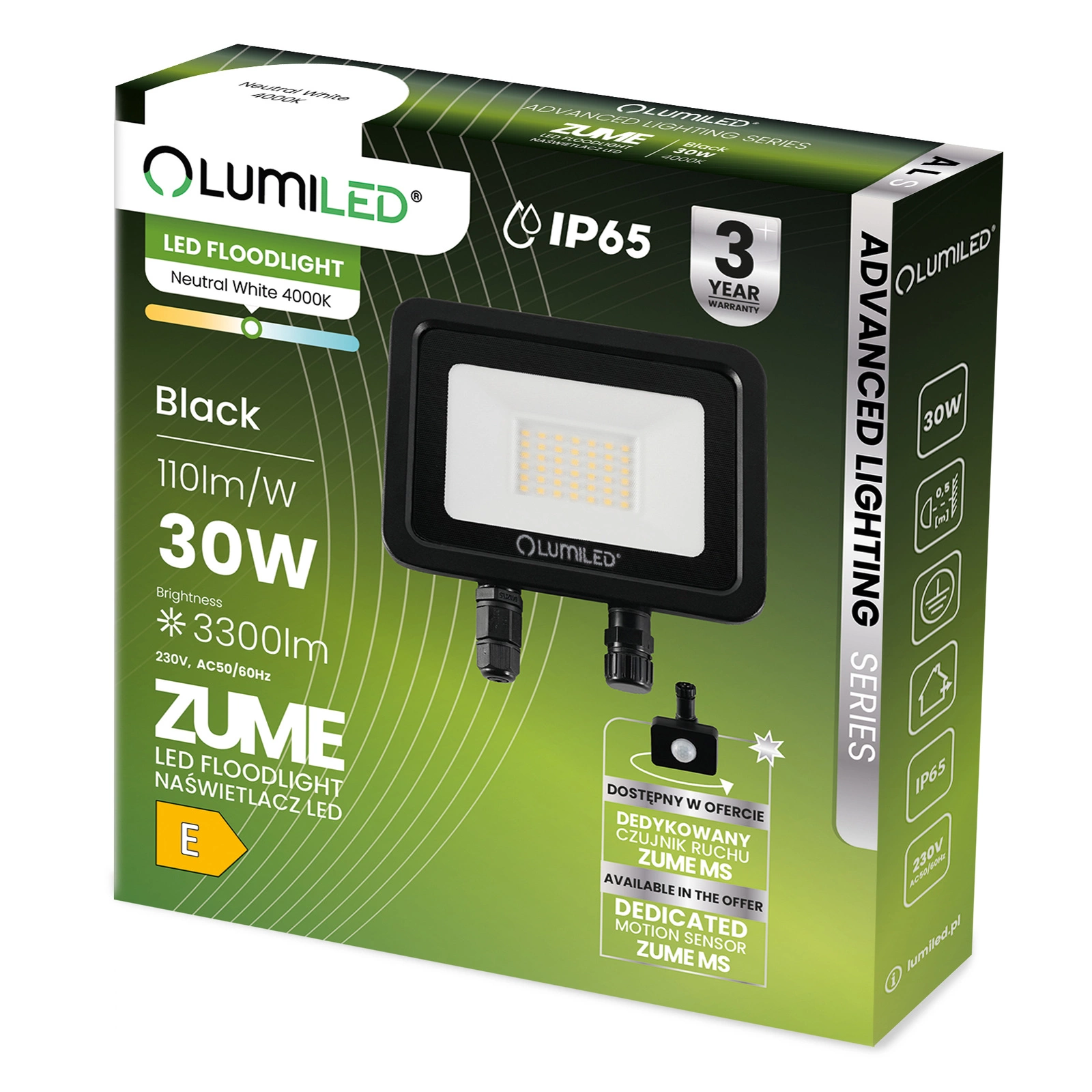 Die hier beschriebene Advanced Lighting Serie umfasst fünf ZUME-Fluter mit unterschiedlichen Wattagen sowie einen ZUME-Bewegungssensor und einen Dämmerungssensor.
