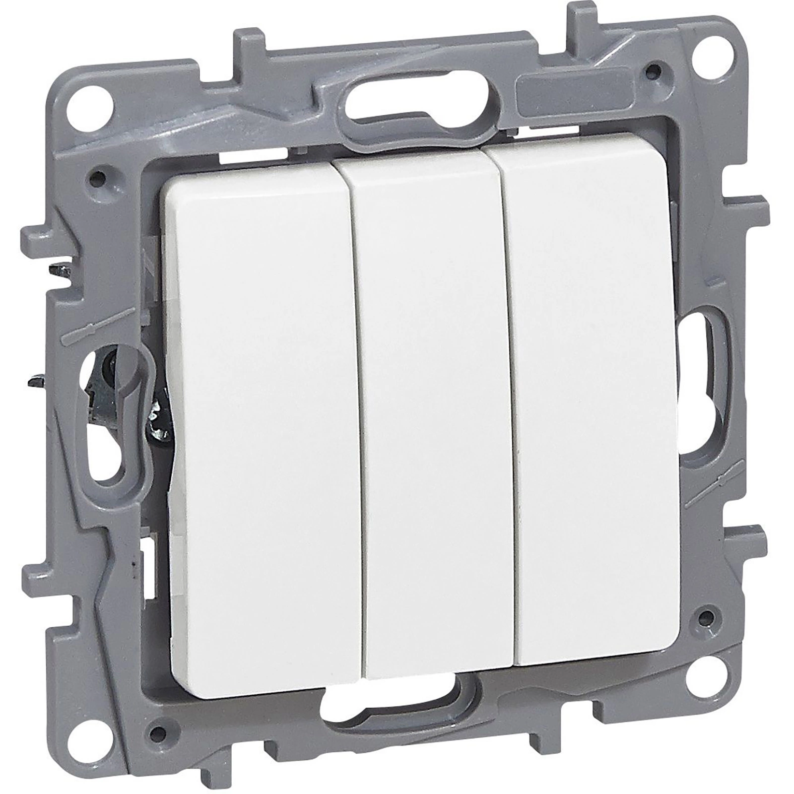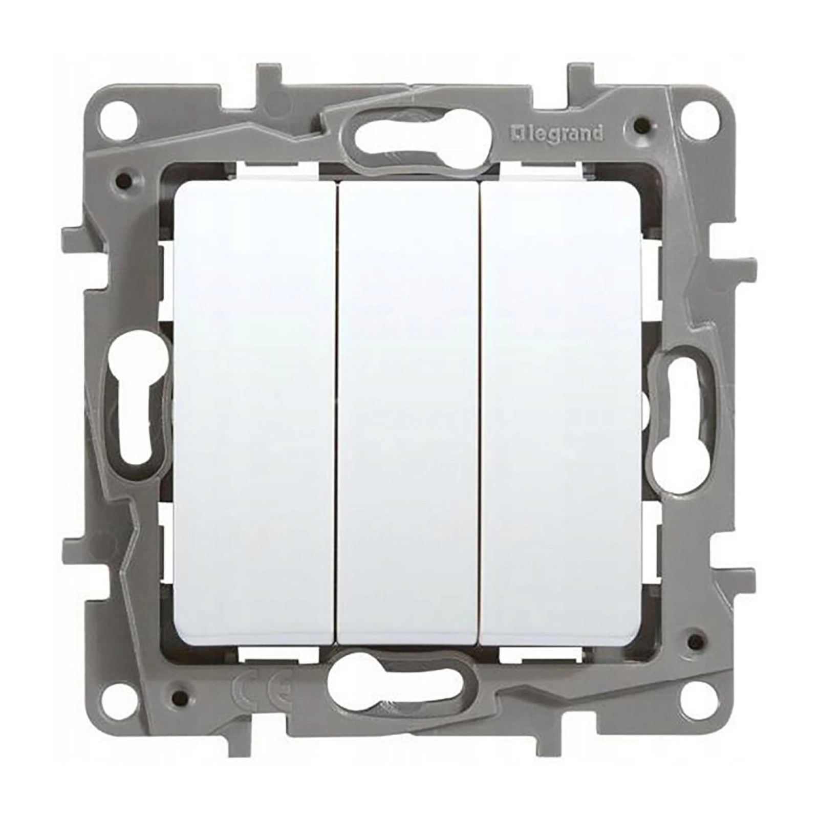 Zweipoliger Standard- Legrand Triple Candlestick-Lichtschalter mit drei Tasten zum Ein- und Ausschalten. Wird im Innenbereich als Lichtschalter verwendet. Dank der Rahmen haftet es fest an der Wand, nimmt beim Biegen wieder seine ursprüngliche Form an und schützt außerdem vor Stößen . Die Steckverbinder können beispielsweise in Reihe geschaltet werden und sorgen dank der Verwendung von Schnellverbindern für eine schnelle Installation.