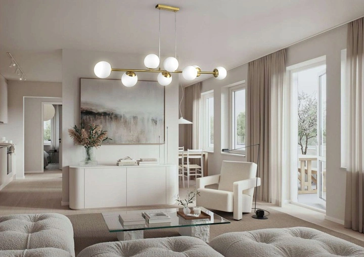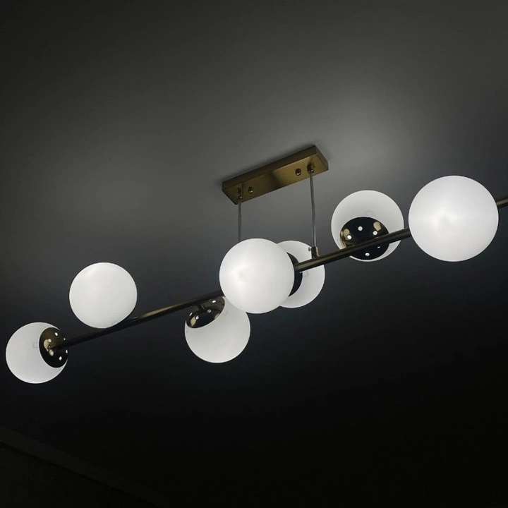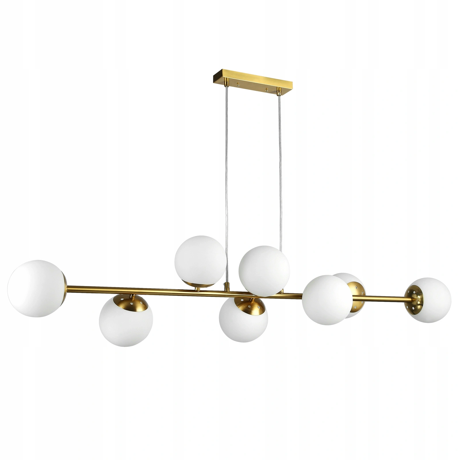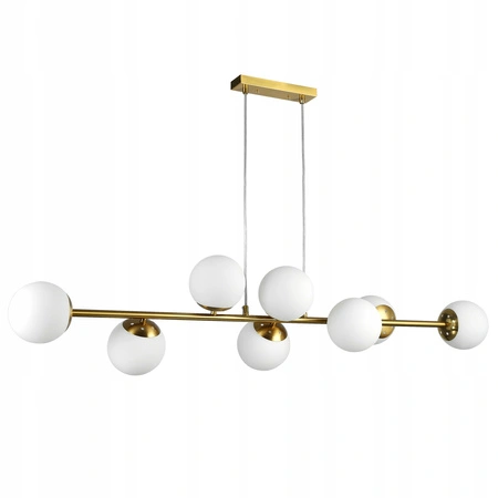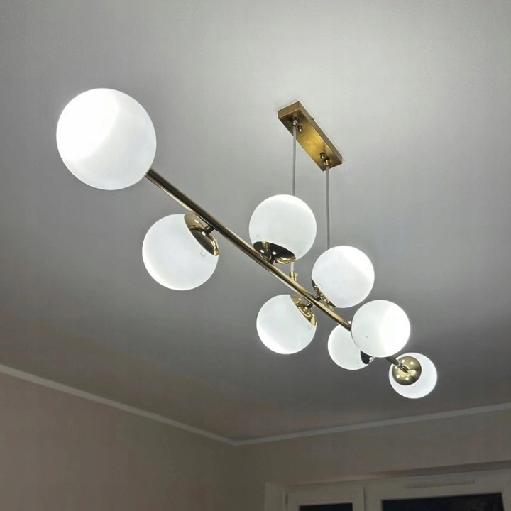 Die Leuchte ist mit bis zu acht Lichtpunkten ausgestattet und eignet sich daher ideal für größere Räume. Sie sorgt für eine gleichmäßige, helle und eindrucksvolle Beleuchtung im gesamten Raum. Die goldene Oberfläche in Kombination mit den milchigen Schirmen schafft ein modernes und repräsentatives Design, das den Charakter Ihrer Einrichtung unterstreicht und ihr einen Hauch von Eleganz verleiht.