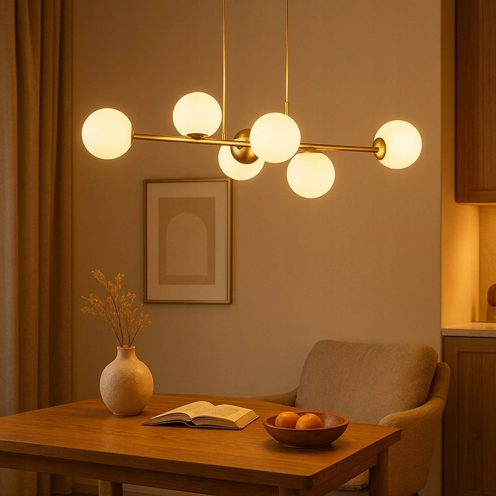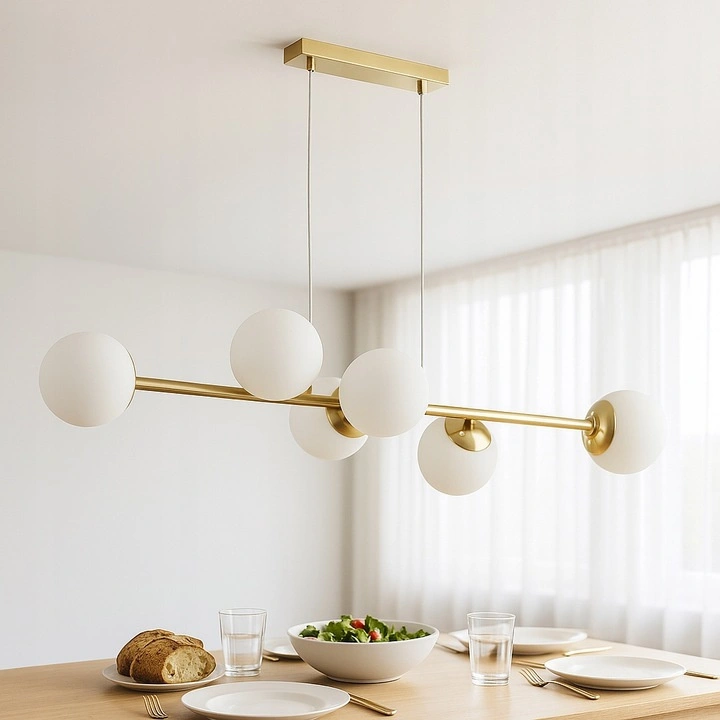 Die Leuchte ist mit bis zu 6 Lichtpunkten ausgestattet, die sich ideal für größere Räume eignen und für eine gleichmäßige, effektive und angenehme Beleuchtung im gesamten Raum sorgen. Die goldene Oberfläche in Kombination mit den milchigen Schirmen verleiht der Leuchte einen prestigeträchtigen Charakter, der den Stil der Einrichtung unterstreicht und ihr eine moderne Eleganz verleiht.