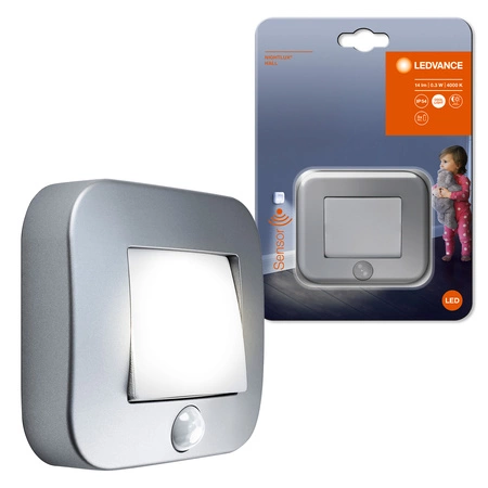 Entdecken Sie moderne Funktionalität mit dem LED Nightlux Hall Nachtlicht von Ledvance. Es besticht durch sein elegantes silbernes Design und die robuste Konstruktion aus Polycarbonat (PC), was es zu einer stilvollen und praktischen Lösung für jedes Interieur macht. Mit einer integrierten 0,25-W-LED-Quelle und einem Lichtstrom von 14 lm sorgt es für Energieeinsparungen und eine sanfte Beleuchtung des umgebenden Raums.