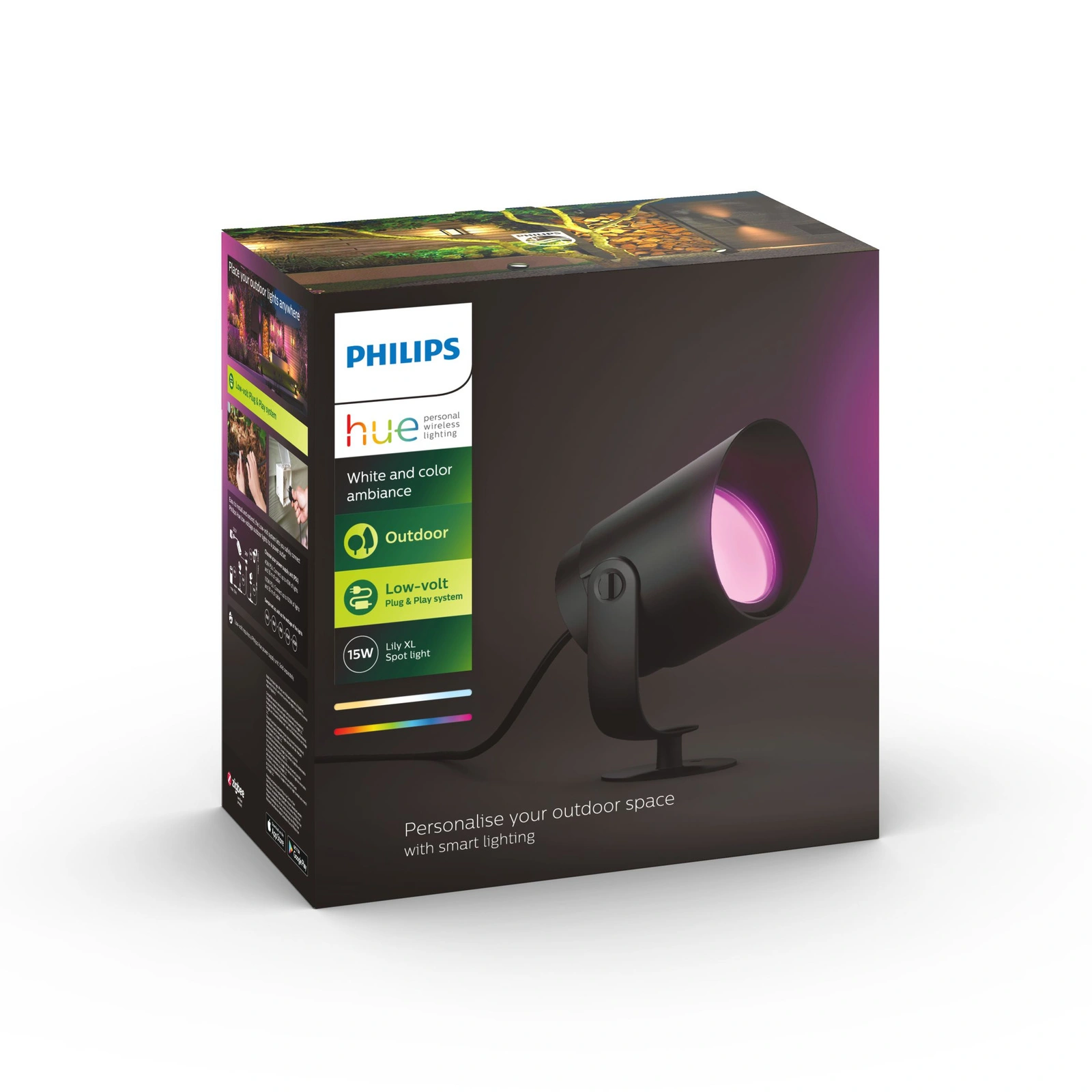 Philips Hue Außenbereich ist eine Serie von Produkten für den Garten, die vom Weltmarktführer in der Beleuchtungsindustrie entwickelt wurde. Intelligente Beleuchtungssysteme jetzt auch für Ihren Garten. Spotlight beleuchtungsfarbe schwarz mit integriertem LED-Lichtmodul aus der LILY XL-Serie mit stärkerem Licht, verborgen in einer Niedervolt-Leuchte können in jedem Bereich im Freien, wie z.B. auf dem Balkon oder der Terrasse, erfolgreich eingesetzt werden und sind dank ihrer robusten und widerstandsfähigen Konstruktion auch ideal für den Einsatz in jedem Garten. Sorgen Sie für ein sicheres Zuhause, schaffen Sie die perfekte Stimmung, genießen Sie diese schöne und funktionale Beleuchtung und nutzen Sie die Vorteile der hue-App einfach und bequem. Philips Hue Lily XL ist eine langlebige und effiziente Richtungsleuchte, die Ihnen nach der Installation sehr lange Zeit wartungsfrei dienen wird.