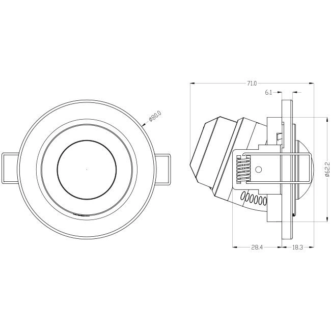 PIR-Bewegungssensor er besteht aus Kunststoff und ist ein moderner Unterputzmelder, der mit Hilfe von Infrarotstrahlung Bewegungen erkennt. Das Gerät ist mit praktischen Halterungen für den einfachen und sicheren Einbau in Zwischendecken ausgestattet. Der Sensor zeichnet sich durch einen einfachen Zugang zu den Einstellungen aus, die für die Einschaltzeit und die Empfindlichkeit der Lichtintensität des Empfängers verantwortlich sind, so dass es nicht notwendig ist, das Gerät zu zerlegen, um die Einstellungen zu ändern.