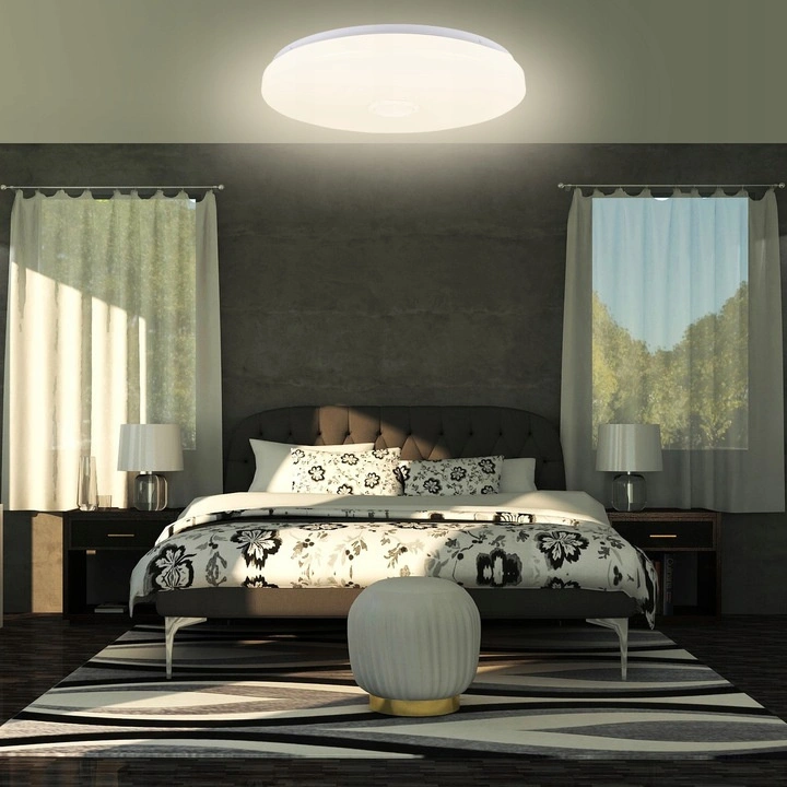Die moderne LED-Deckenleuchte ist mit 60 SMD 2835 LEDs und 45 SMD 5050 RGB LEDs ausgestattet und bietet die Möglichkeit zum Dimmen und Ändern der Lichtfarbe und -farbe . Das Gerät lässt sich über die mitgelieferte Fernbedienung regulieren , wodurch Sie die Lichtintensität anpassen und von warmer auf neutrale oder kalte Farbe umschalten können . Die Fernbedienung ist funkgesteuert und somit bequem zu bedienen, ohne dass man sie zum Ändern der Einstellungen auf die Decke richten muss.