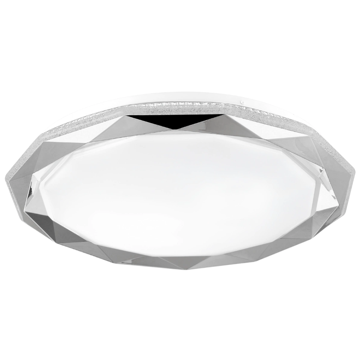 Eine moderne LED-Deckenleuchte mit einem Durchmesser von 50 cm, der Serie GLOSSY von POLUX , in Weiß/Chrom glänzend, mit einer hocheffizienten, energiesparenden LED- Lichtquelle mit max. Leistung 72W und Lichtstrom 4320lm. Die Lampe ist mit LED-Dioden ausgestattet , die sanfte Reflexionen erzeugen und für ein gleichmäßig gestreutes Licht sorgen, wodurch der negative Effekt der Blendung beseitigt wird.