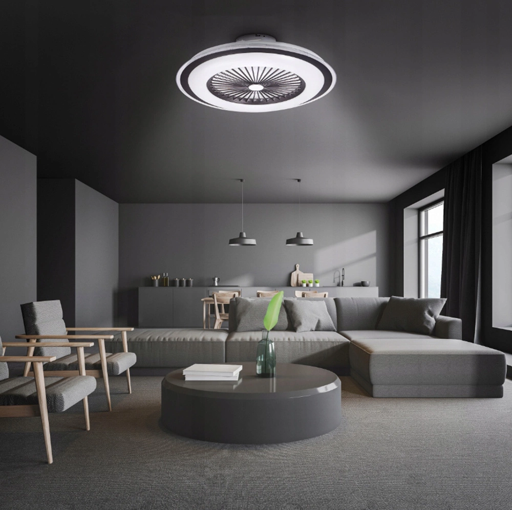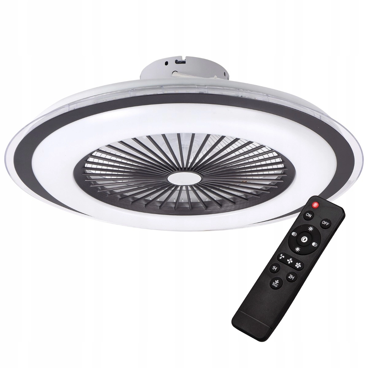 Moderner LED-Kronleuchter Rhodes-Ventilator. Sie ist mit 64 SMD 2835 LEDs ausgestattet, die über die Möglichkeit zum Dimmen und Ändern der Lichtfarbe verfügen. Über eine spezielle Fernbedienung (im Lieferumfang enthalten) wird der Betrieb des Geräts gesteuert, wodurch wir die Lichtintensität reduzieren oder erhöhen oder die Farbe von warm auf neutral oder kalt ändern können. Die Fernbedienung funktioniert per Funk, sodass wir zum Ändern der Einstellungen keinen bestimmten Punkt anvisieren müssen.