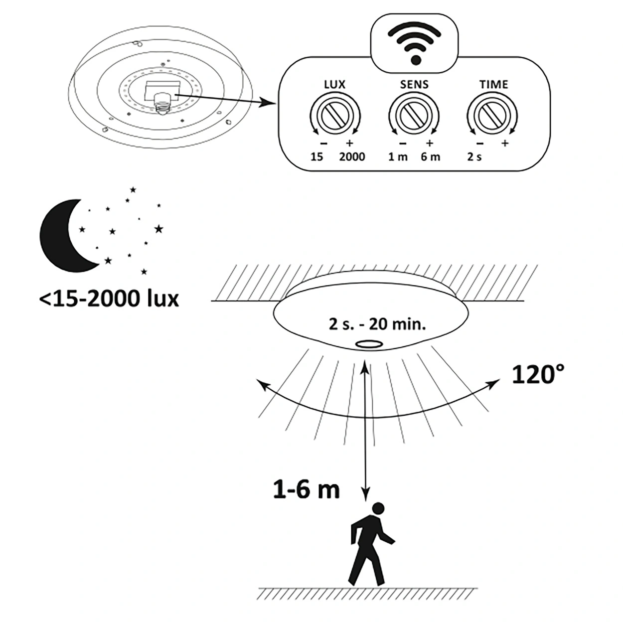 Der eingebaute, voll einstellbare Bewegungs- und Dämmerungssensor ermöglicht es Ihnen, den Betrieb der Leuchte perfekt an die Umgebungsbedingungen anzupassen. Mit drei Reglern können Sie die Erfassungsempfindlichkeit (1-6 m), die Beleuchtungsdauer (von 2 s bis 20 min) und die Dämmerungsschwelle in einem weiten Bereich von 15-2000 Lux einstellen. Das bedeutet, dass sich die Lampe nur dann einschaltet, wenn sie wirklich benötigt wird - für Komfort, Energieeinsparungen und einen wartungsfreien Betrieb jeden Tag.
