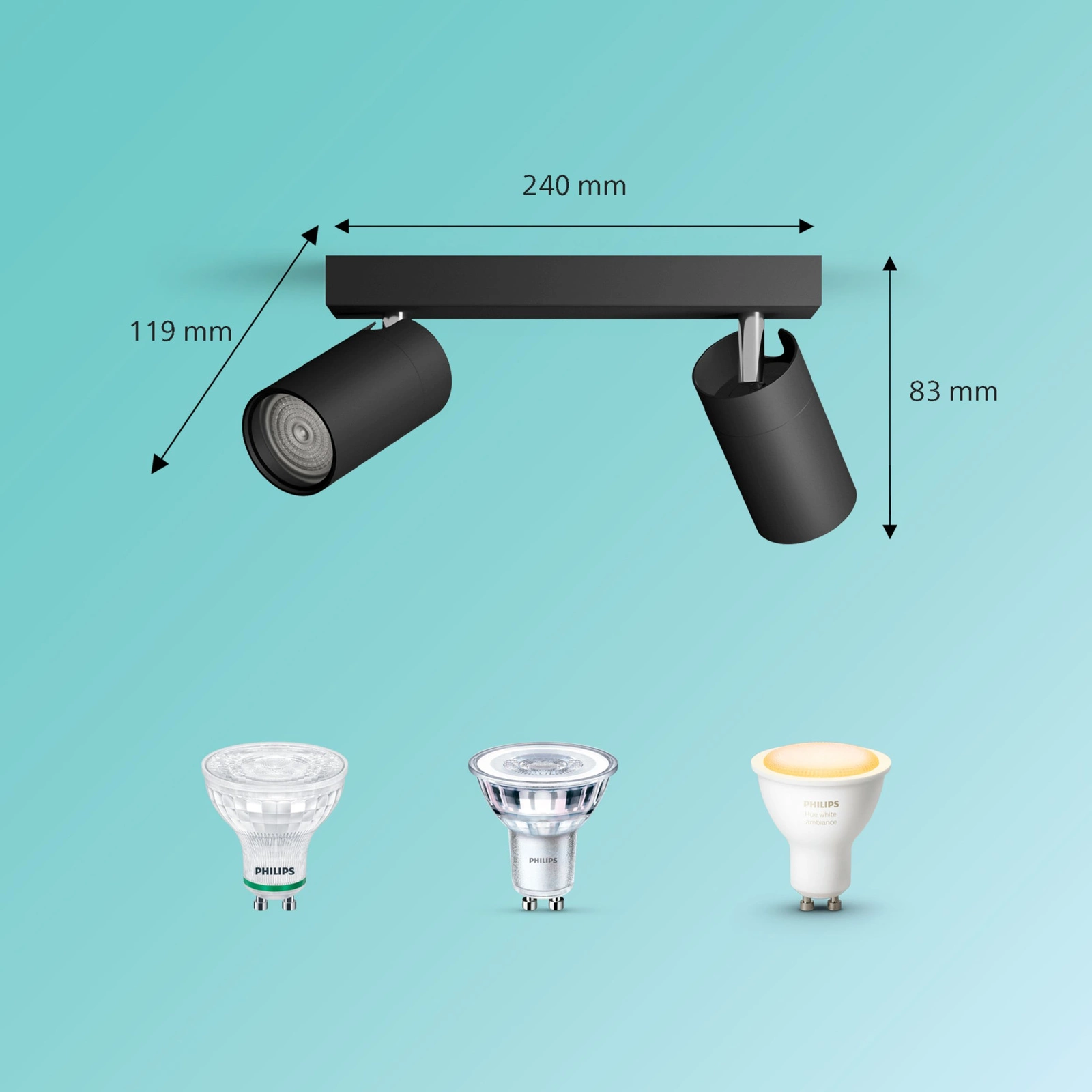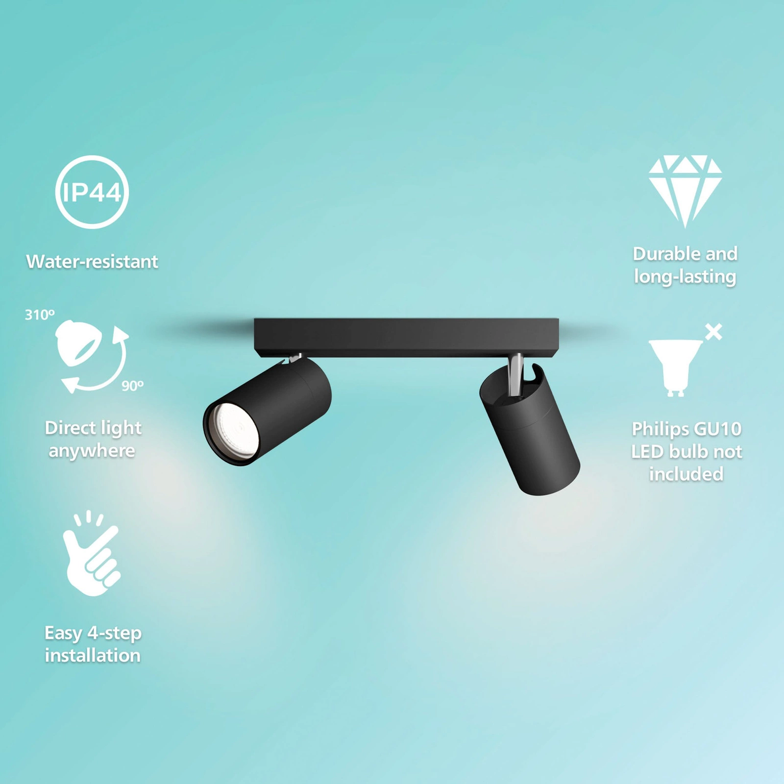 Wir präsentieren eine moderne Deckenstrahlerlampe von Philips, die Funktionalität und Ästhetik perfekt miteinander verbindet. Das Modell Kosipo in eleganter schwarzer Farbgebung ist eine ideale Wahl für alle, die Stil und hochwertige Verarbeitung zu schätzen wissen. Sie ist mit zwei GU10-Fassungen ausgestattet, was eine gerichtete Beleuchtung verschiedener Bereiche des Raumes ermöglicht. Die ausgezeichneten Schutzeigenschaften werden durch die Schutzart IP44 bestätigt, wodurch die Lampe feuchtigkeitsbeständig und für die Installation in Badezimmern und anderen Räumen mit hoher Luftfeuchtigkeit geeignet ist. Die Kosipo Deckenleuchte fügt sich perfekt in den modernen Designtrend ein und ist somit eine ideale Ergänzung für zeitgenössische Innenräume. Die robuste Konstruktion garantiert Langlebigkeit und Zuverlässigkeit über einen langen Zeitraum. Sie wird mit einer Standardspannung von 220-240 V betrieben und ist einfach zu installieren und zu verwenden. Dank des durchdachten Designs schafft das Licht der Strahler eine gemütliche Atmosphäre und unterstreicht den einzigartigen Charakter Ihrer Einrichtung.
