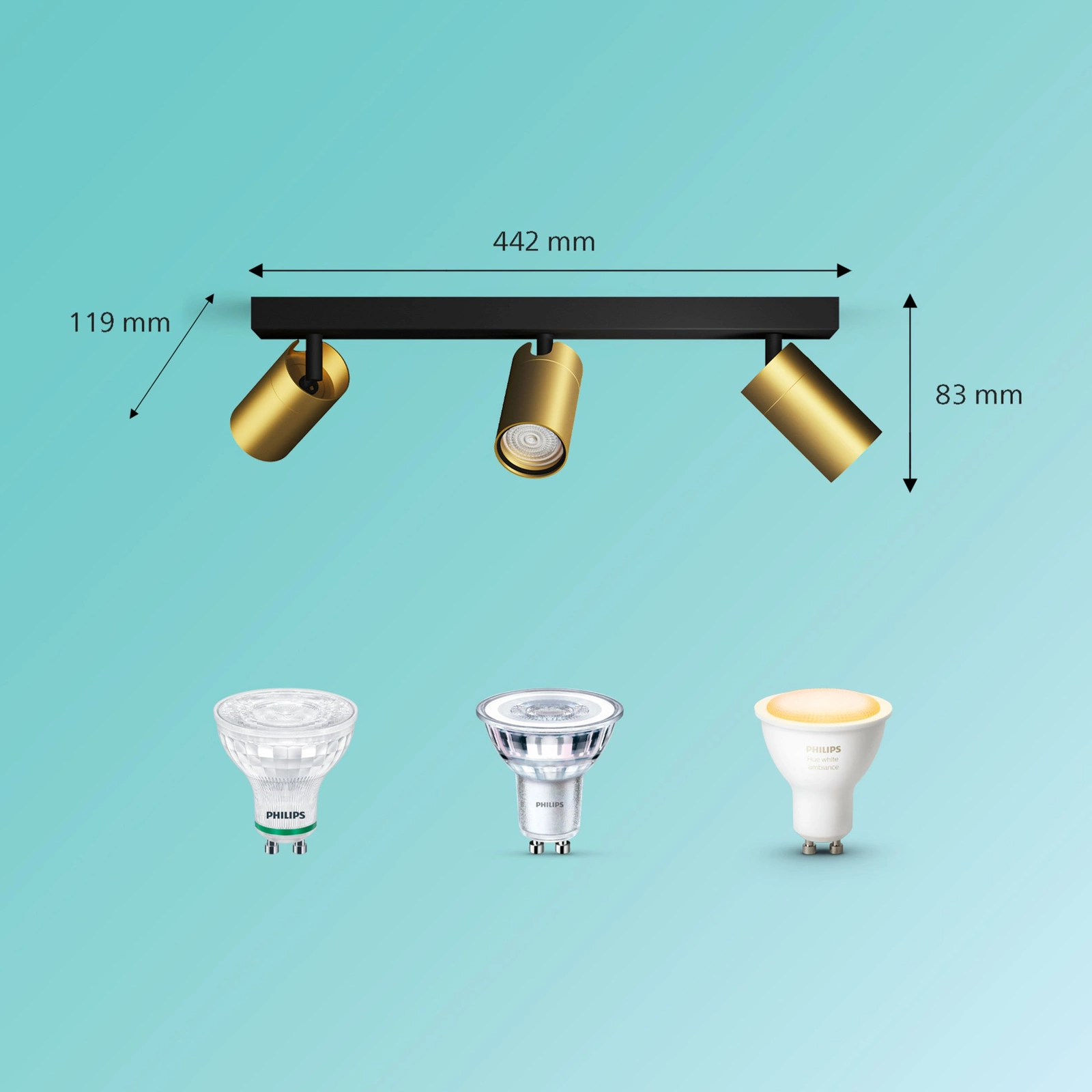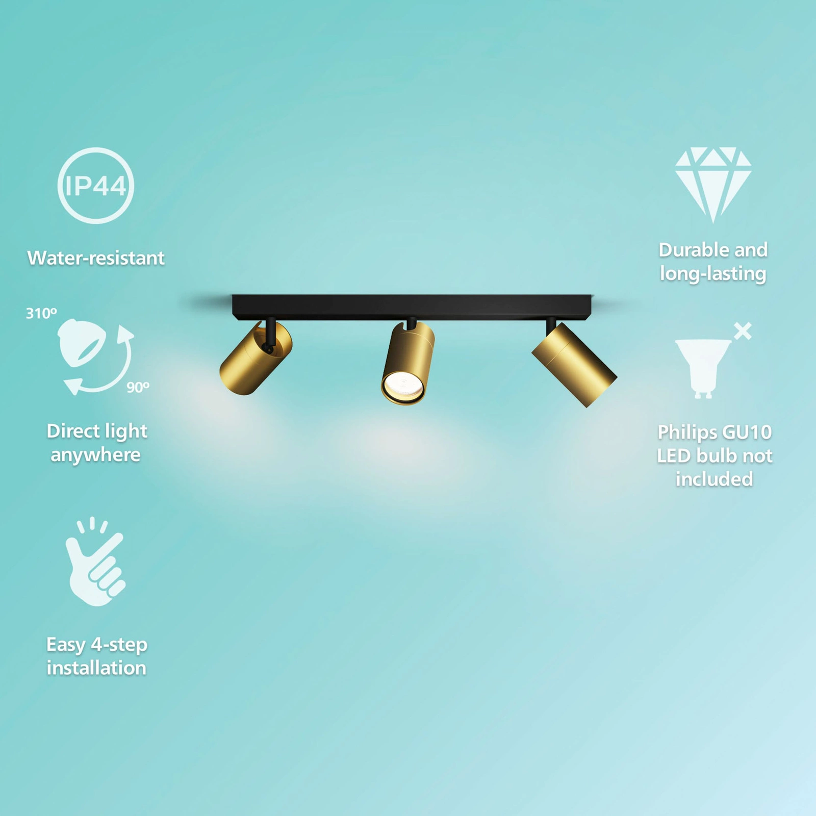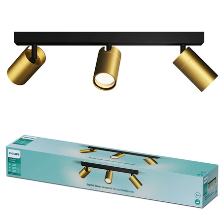 Die elegante Philips Kosipo Spotlight Deckenleuchte fügt sich perfekt in moderne Innenräume ein. Diese einzigartige Deckenleuchte ist mit 3 Reflektoren ausgestattet, jeder mit einer separaten Lichtquelle vom Typ GU10, sodass Sie den Lichtstrahl optimal nach Ihren individuellen Bedürfnissen ausrichten können. Die Kombination aus Kupfer und Schwarz unterstreicht perfekt den Stil und die Ästhetik eines Raumes und verleiht ihm Eleganz und Raffinesse. Ihre Modernität geht Hand in Hand mit ihrer Funktionalität und macht sie zu einem perfekten Stück für das Wohnzimmer, das Esszimmer und das Wohnzimmer gleichermaßen. Neben ihrem attraktiven Design verfügt die Kosipo-Lampe über die hohe Schutzart IP44, die sie unempfindlich gegen Feuchtigkeit macht und perfekt für Bereiche geeignet ist, die mit Wasser in Berührung kommen, wie z. B. Bäder und Küchen. Die Stromversorgung deckt einen Spannungsbereich von 220-240 V ab und gewährleistet einen stabilen und sicheren Betrieb. Dank des modernen Stils und der Möglichkeit, die Position jedes Strahlers zu verstellen, wird dieses Modell nicht nur Ihre Beleuchtungsbedürfnisse erfüllen, sondern auch zu einem unverwechselbaren Bestandteil Ihrer Inneneinrichtung werden. Lassen Sie die Kosipo-Lampe sowohl ein praktisches als auch ein dekoratives Element für Ihr Zuhause sein.