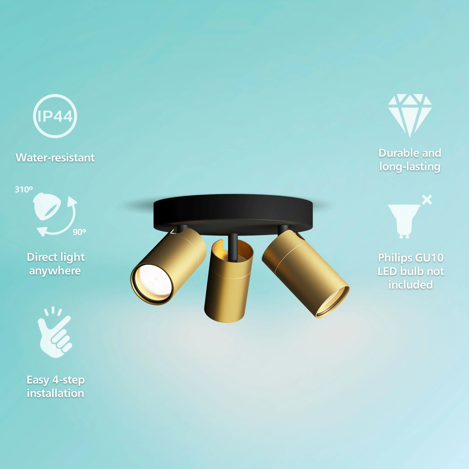 Die elegante Deckenleuchte Kosipo Philips spotlight besticht durch ihr modernes Design. Ihre kupfer-schwarze Farbgebung verleiht dem Interieur einen raffinierten Touch. Ausgestattet mit drei GU10-Fassungen, von denen jede das Einsetzen von Glühbirnen ermöglicht, die in jedem Raum für eine hervorragende Beleuchtung sorgen. Darüber hinaus verfügt die Leuchte über die Schutzklasse IP44, wodurch sie feuchtigkeitsbeständig ist und auch im Bad oder in der Küche perfekt zur Geltung kommt. Das Produkt zeichnet sich durch seine solide Verarbeitung und die hochwertigen Materialien aus. Die Stromversorgung der Lampe liegt zwischen 220-240V, was einen effektiven Betrieb gewährleistet. Die Kosipo-Lampe ist eine ideale Wahl für Liebhaber des modernen Stils und bietet sowohl Funktionalität als auch Lichtästhetik. Sie fügt sich perfekt in eine Vielzahl von Arrangements ein und unterstreicht deren modernen Charakter.