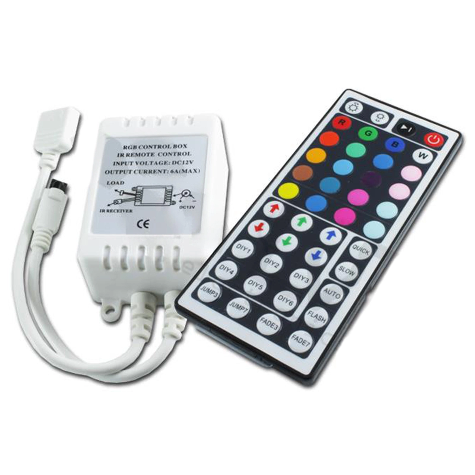 Der vorgestellte Controller besteht aus hochwertigen Materialien und ist für den Betrieb mit RGB-LED-Streifen geeignet. Die Nennspannung des Geräts beträgt 12 V DC und der maximale Strom beträgt 6 A. Mit der im Set enthaltenen Fernbedienung können Sie Helligkeit und Lichtfarbe unabhängig voneinander einstellen. Der Controller verfügt über bis zu 44 Tasten , sodass Sie mit einer der Tasten schnell hervorragende Lichteffekte erzielen können.