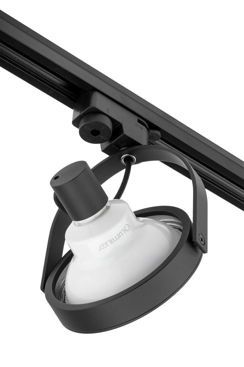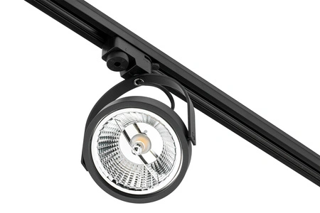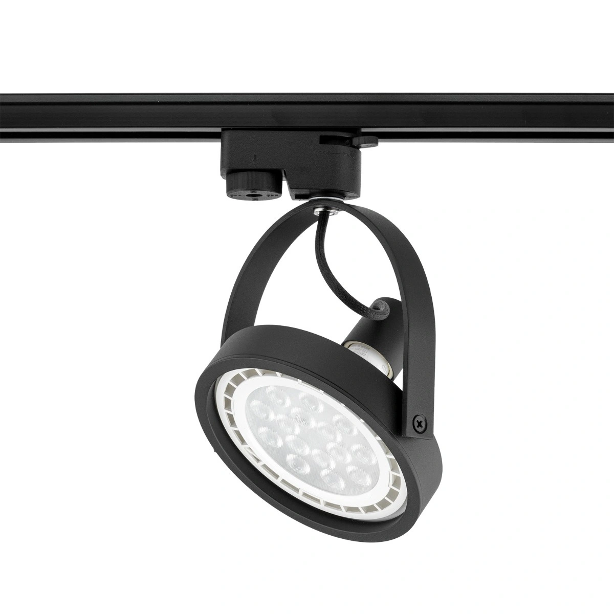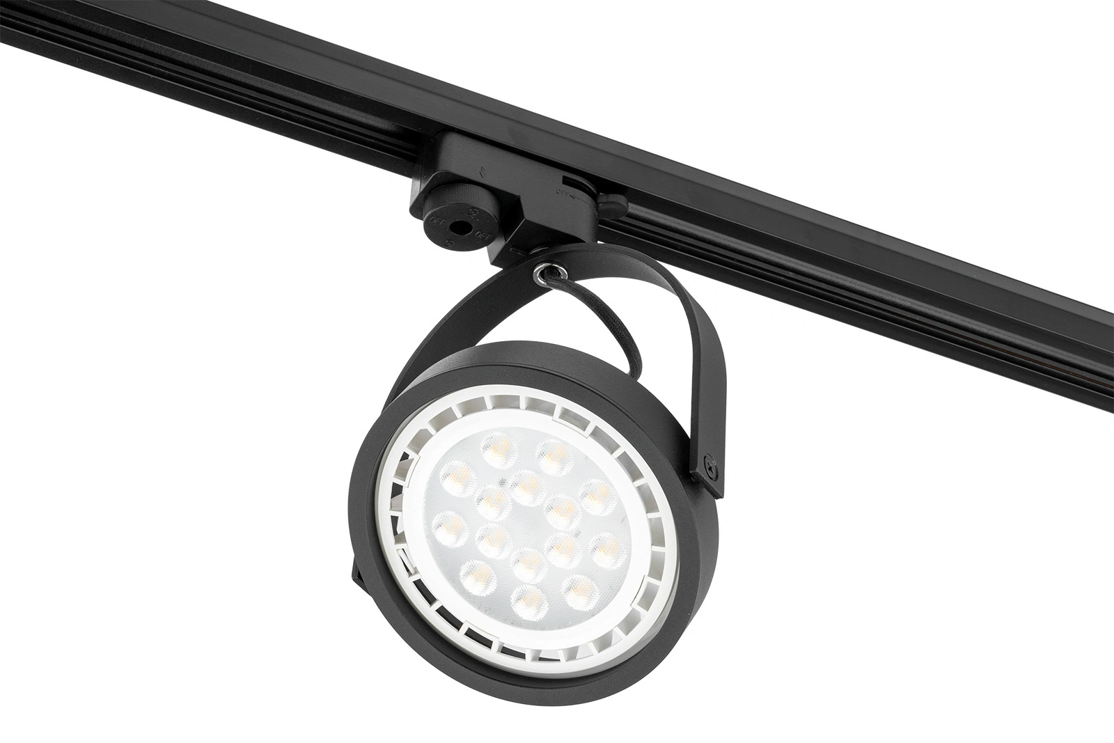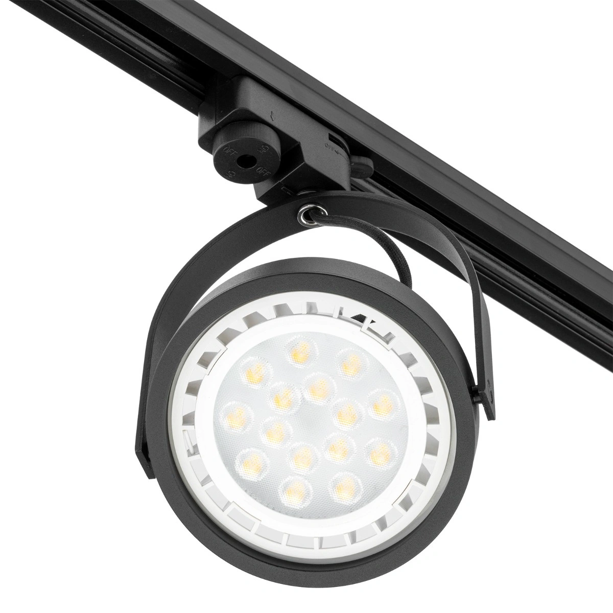 Schwarzer Schienenstrahler mit austauschbarer Lichtquelle mit GU10- Sockel . Die Lampe mit einer ES111-Glühbirne mit engem Abstrahlwinkel eignet sich perfekt für die Beleuchtung von Orten wie einem Büro, einem Flur oder einem Schaufenster.