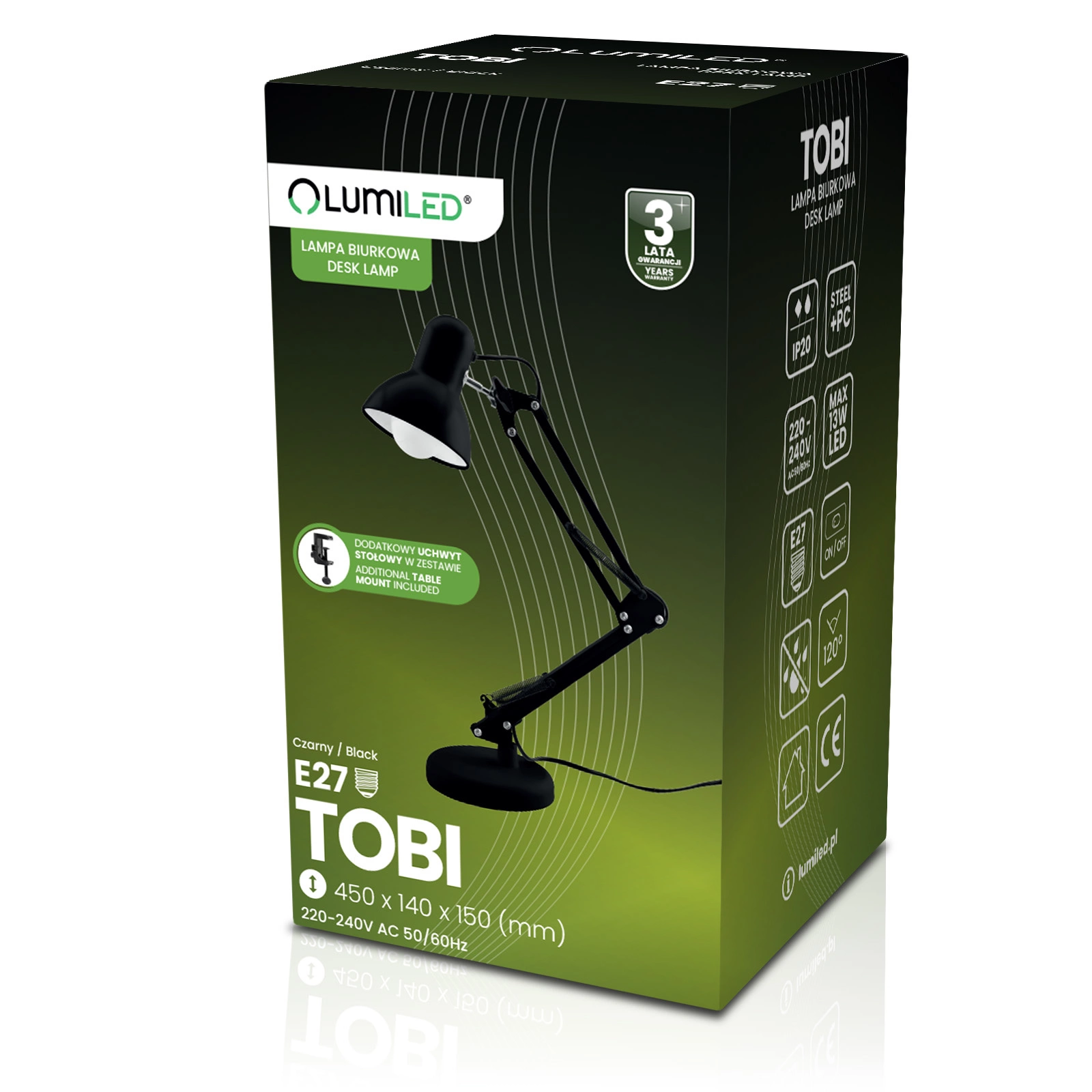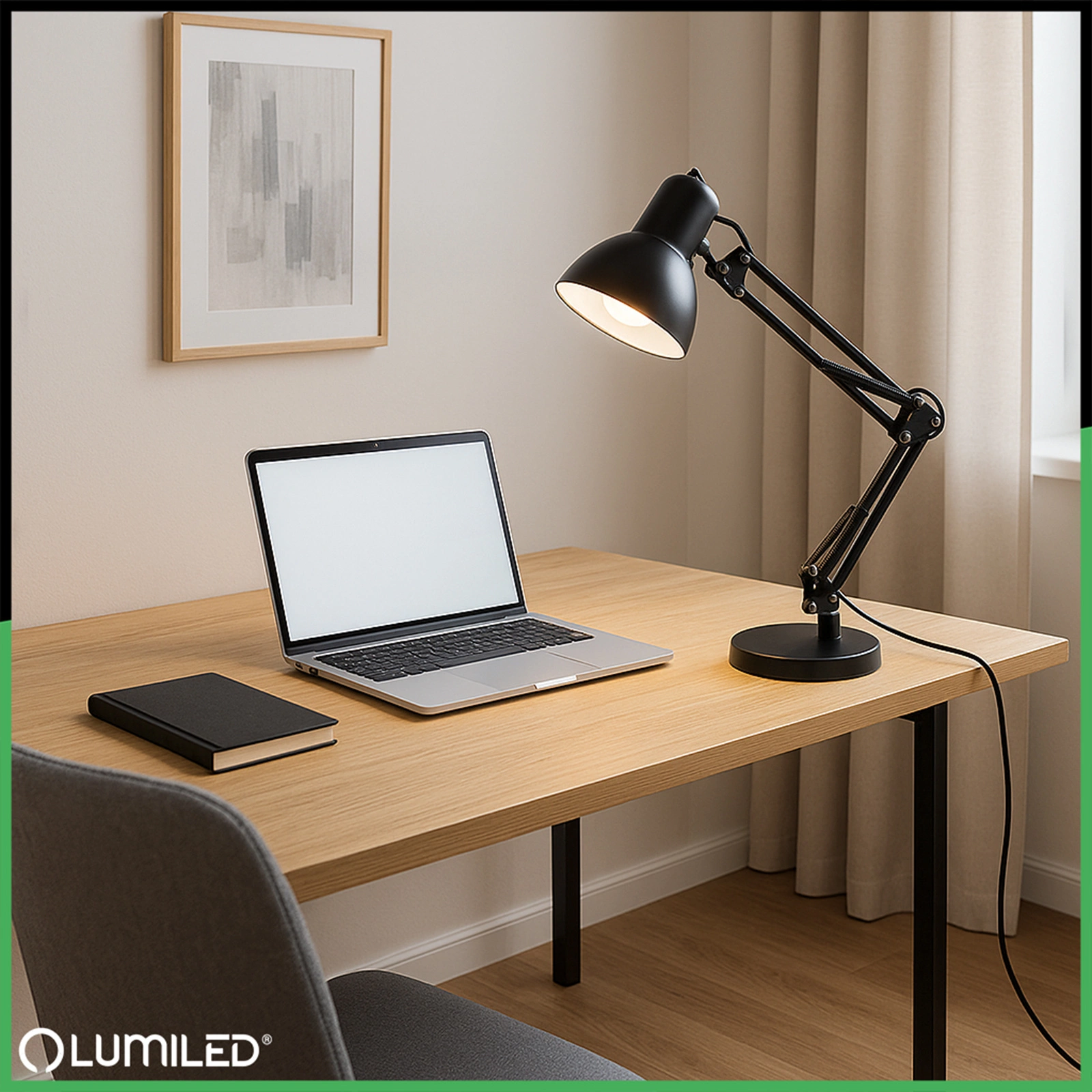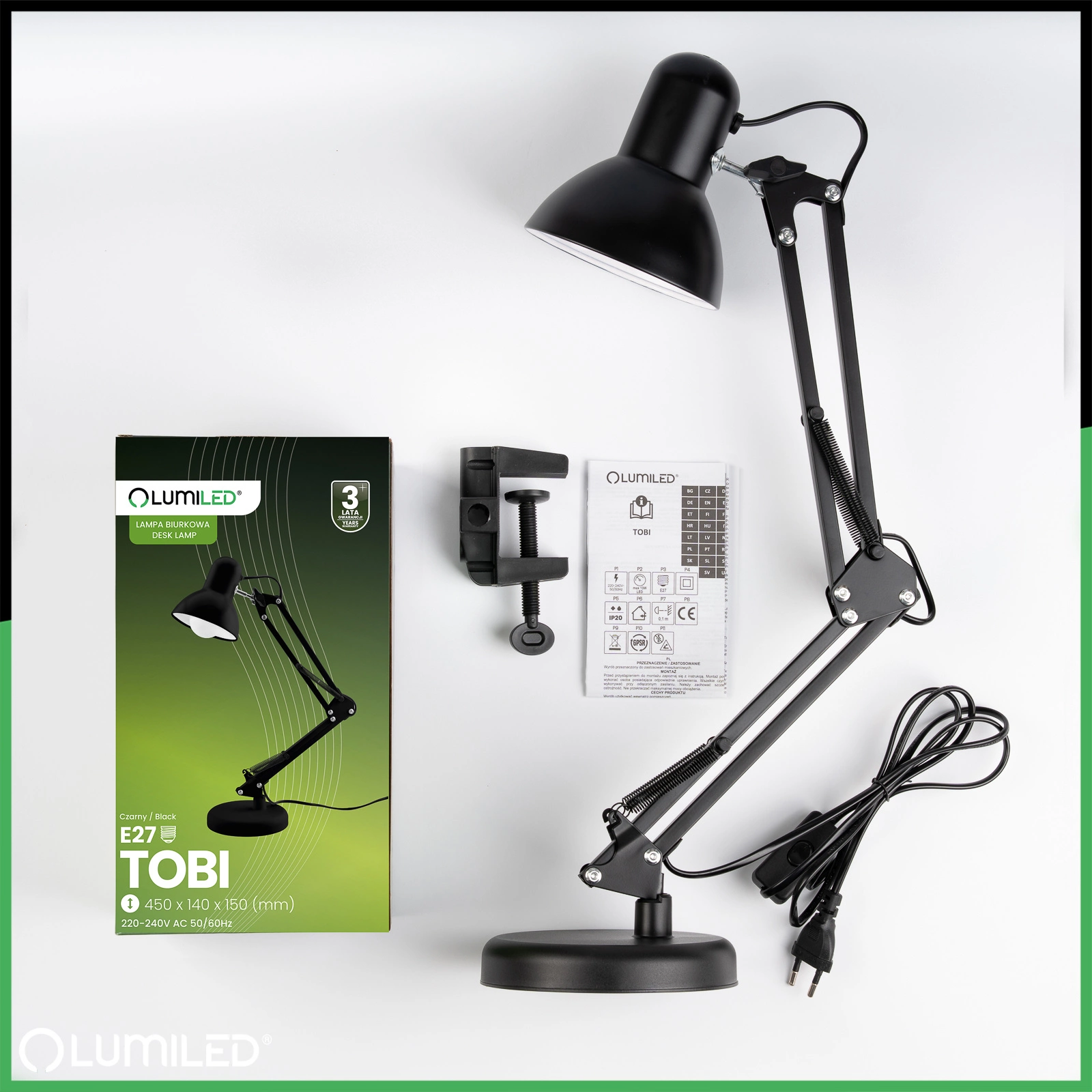 E27-Zeichentischlampe TOBI Schwarz + Lumiled-Tischhalterung