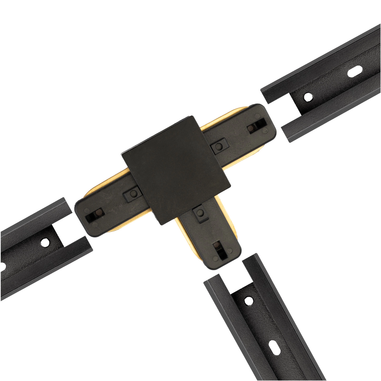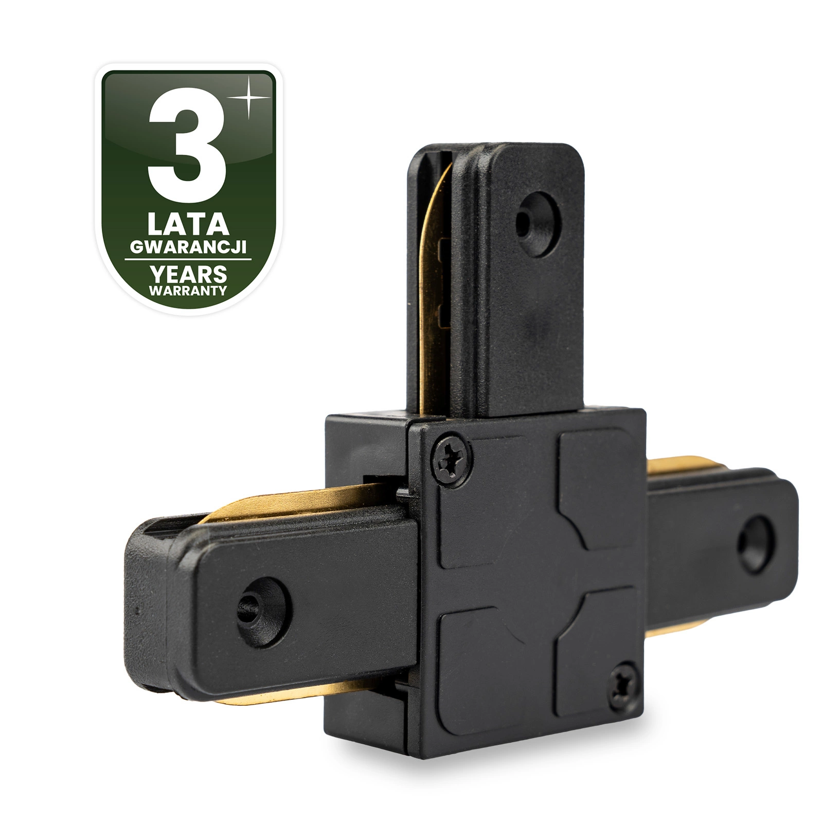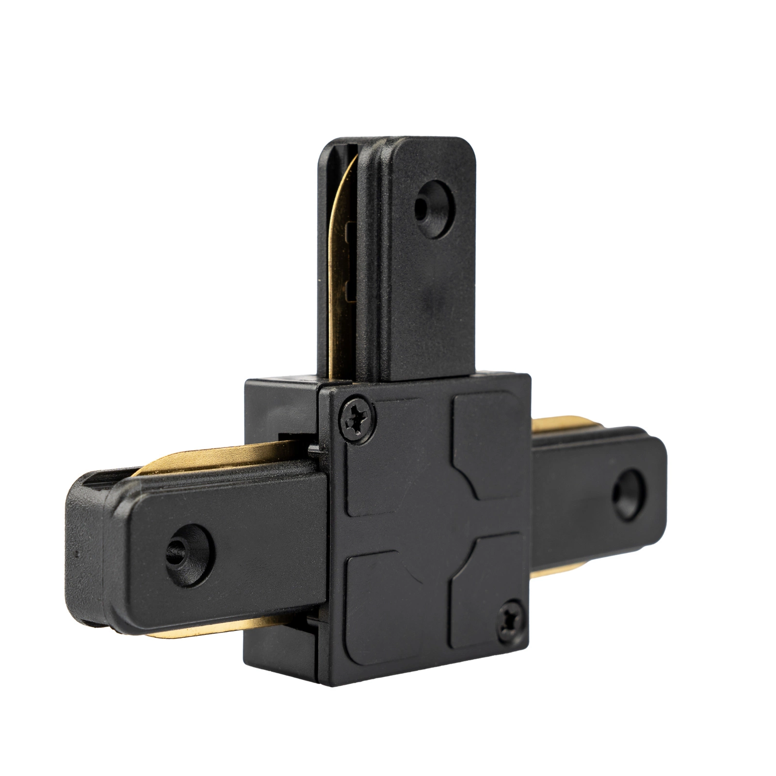 Ein Dreifachverbinder in Schwarz, der die Verbindung von Sammelschienen in Reihe und im 90°-Winkel ermöglicht . Durch den Einsatz von Verbindern können Sie die Schienen für Stromschienenleuchten verlängern.