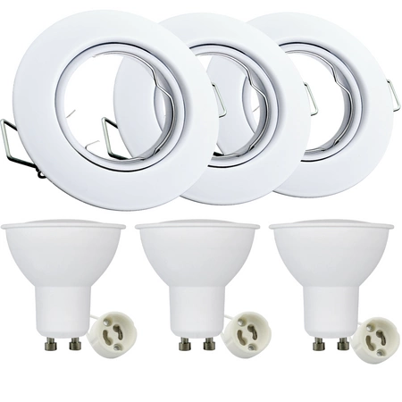 Das Set aus 3x runder Halogenleuchte + GU10-LED-Leuchtmittel + GU10-Keramikfassung ist ein einbaufertiges Komplettpaket. Die Deckenbefestigungen bestehen aus hochwertigem Metall und sind daher solide und zuverlässig. Die hier vorgestellten Leuchten sind weiß und passen problemlos zur Einrichtung der meisten modernen Wohnungen. Die im Set enthaltenen Leuchtmittel strahlen ein angenehmes, weißes Licht mit einer Leistung von 3,5 W und einem Lichtstrom von 250 lm aus .