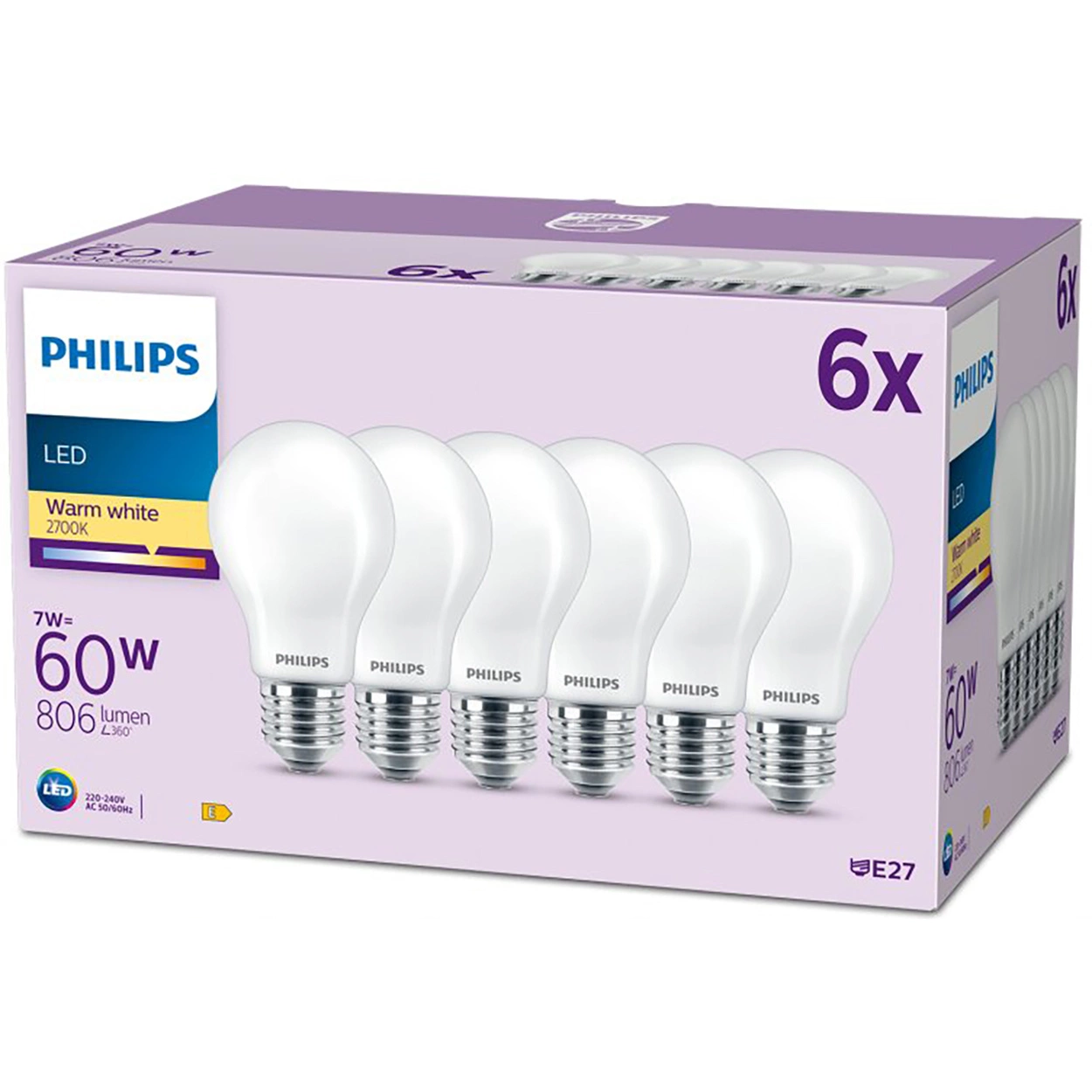 Entdecken Sie unglaubliche Leistung und Effizienz mit einem Set aus sechs Philips LED-Lampen, die Ihr Interieur in eine Oase der Wärme und des Komforts verwandeln. Dank der LED-Technologie mit einer Nennleistung von 7 W ersetzen sie herkömmliche 60-W-Glühlampen und sorgen für Energieeinsparungen und Effizienz. Jede Glühbirne hat einen Lichtstrom von 806 Lumen und einen Farbwiedergabeindex von Ra 80, was eine originalgetreue Wiedergabe der Farben in Ihrer Umgebung garantiert.