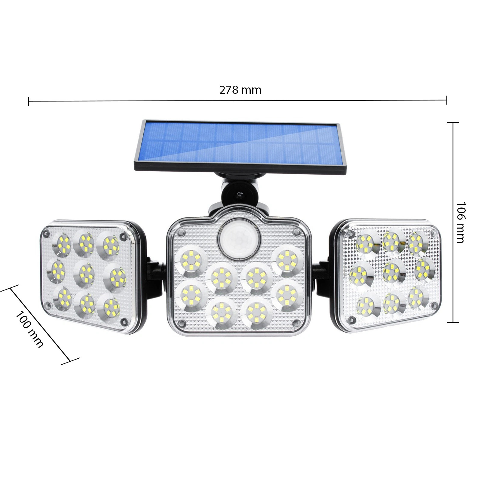 Der Fluter verfügt über einen PIR-Bewegungssensor mit einem Wirkungswinkel von 120° im Bereich von 4 - 6 m. Nach Erkennen der Dämmerung wechselt das Produkt in den Standby- Modus und schaltet sich aus, bei Bewegungserkennung leuchtet es mit 100 % Helligkeit auf