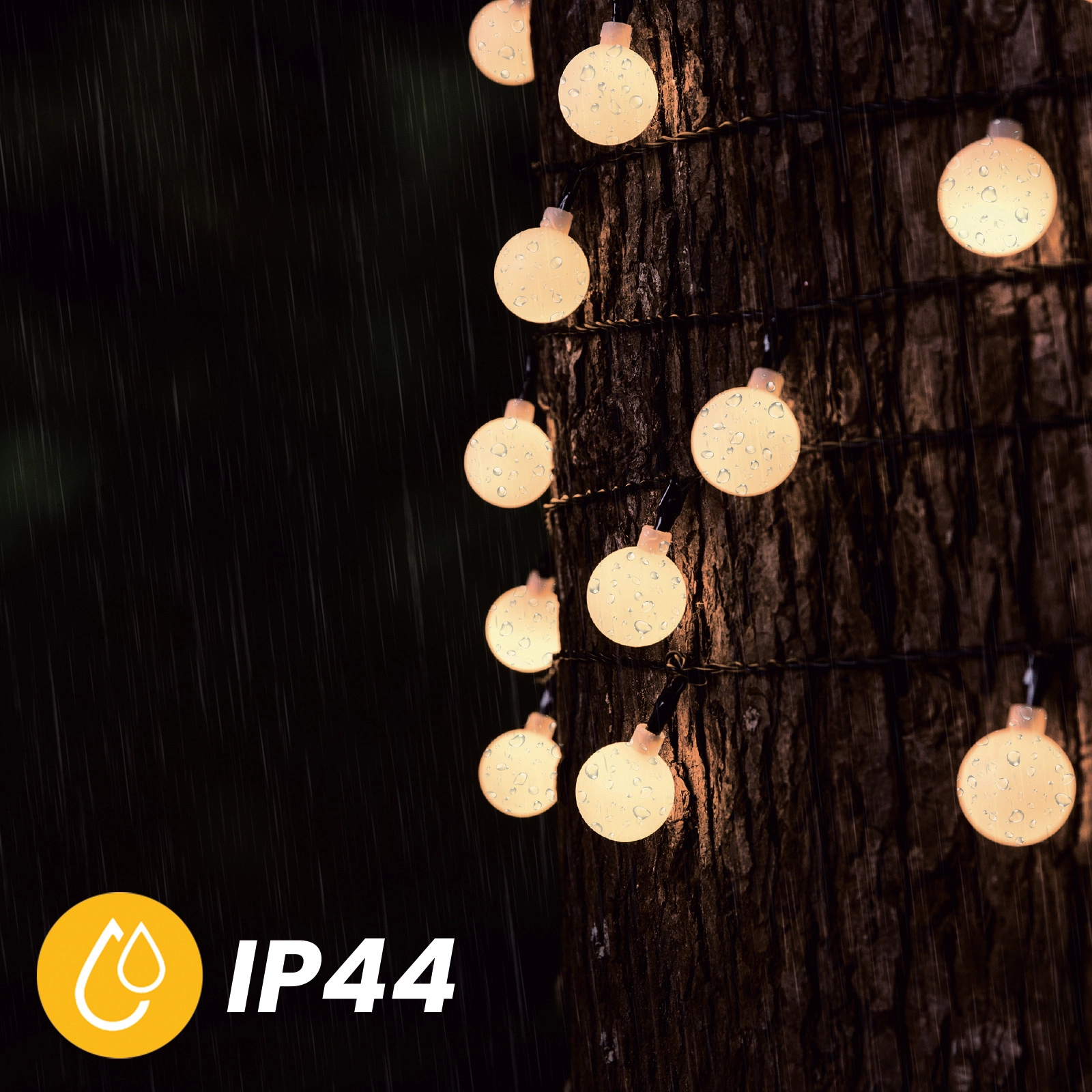Die Girlande hat eine hohe Schutzklasse von IP44, d. h. sie ist spritzwassergeschützt und widerstandsfähig gegen härtere Witterungsbedingungen. Sie können ihr Leuchten unabhängig von Regen oder Feuchtigkeit genießen. Sie ist ideal für die Dekoration Ihres Gartens oder Ihrer Terrasse bei jedem Wetter. Einmal installiert und aktiviert, arbeitet die Solargirlande selbstständig - tagsüber sammelt sie Sonnenenergie, um bei Dunkelheit ihre Umgebung zu beleuchten. Ein einfacher Druck auf den ON/OFF-Knopf genügt, um die Girlande ein- und auszuschalten und zwischen Dauerlicht und Blinkmodus zu wechseln, um einen dynamischen, dekorativen Akzent in jedes Arrangement zu bringen.