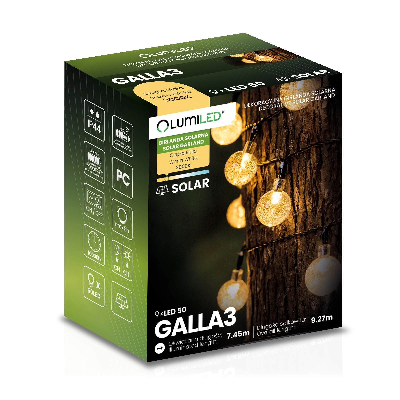 Die GALLA3 Solargirlande der bekannten und renommierten Beleuchtungsmarke Lumiled ermöglicht es Ihnen, eine einzigartige Atmosphäre in Ihrem Garten, auf Ihrer Terrasse oder Ihrem Balkon zu schaffen. Es handelt sich um eine einzigartige Lichtdekoration, die Eleganz, Energieeinsparung und Zweckmäßigkeit perfekt kombiniert, um eine warme und gemütliche Aura in jeder Umgebung zu schaffen. Die Girlande besteht aus 50 transparenten Acrylkugeln mit einem Durchmesser von 2,3 cm, in denen sich jeweils eine warmweiße LED befindet. Sie strahlen ein weiches, stimmungsvolles Licht aus, das sich perfekt als Gartendekoration eignet.