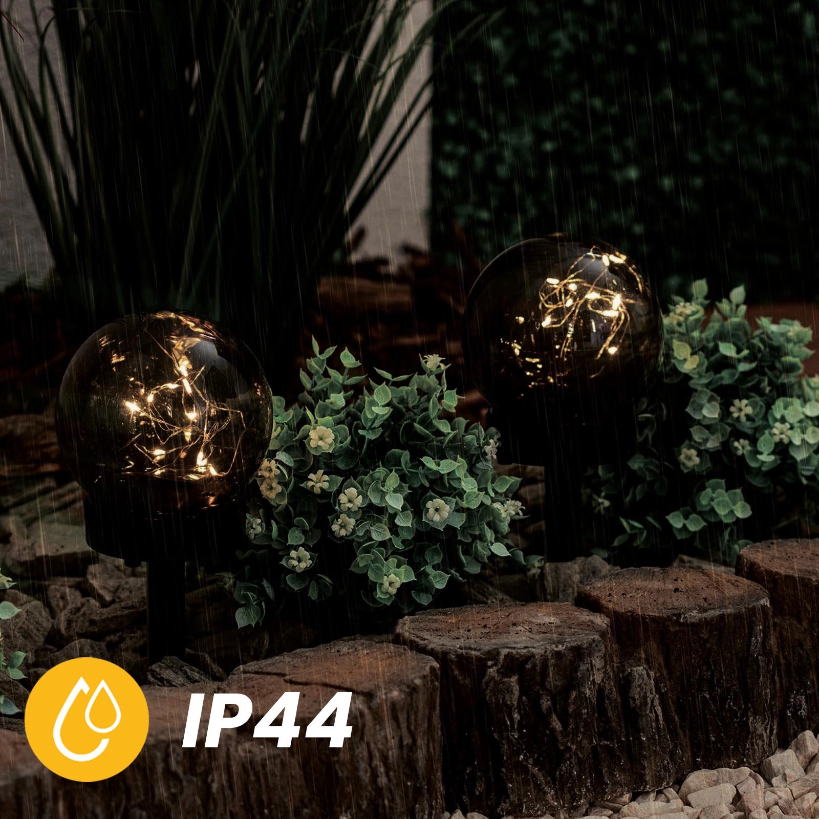 Der Spieß ermöglicht eine einfache und stabile Befestigung im Boden und verfügt über einen praktischen Ein- und Ausschalter, mit dem Sie die Beleuchtung manuell steuern können. Auf diese Weise können Sie einfach und schnell entscheiden, wann die Lampe leuchten soll, was den Benutzerkomfort erhöht und hilft, Energie zu sparen. Die IP44-zertifizierte Solarlampe ist die perfekte Lösung für alle, die eine zuverlässige und langlebige Außenbeleuchtung suchen. Dadurch ist das Produkt vor Wassertropfen geschützt, die aus jedem Winkel fallen können. Durch ihre robuste Bauweise und ihre Beständigkeit gegen Feuchtigkeit und Staub ist die Solarlampe ideal für die Beleuchtung von Gärten, Terrassen, Wegen oder Einfahrten.