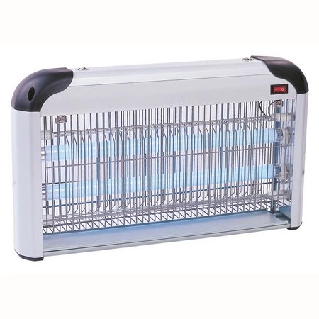 Polux Insektenvernichterlampe . Die UV-Lampe lockt Insekten an, die durch das Elektrogitter abgetötet werden und dann auf die Schale fallen. Eine 30-W- Lampe , ausgestattet mit zwei Lichtquellen – 10-W- UVA-Leuchtstofflampen .