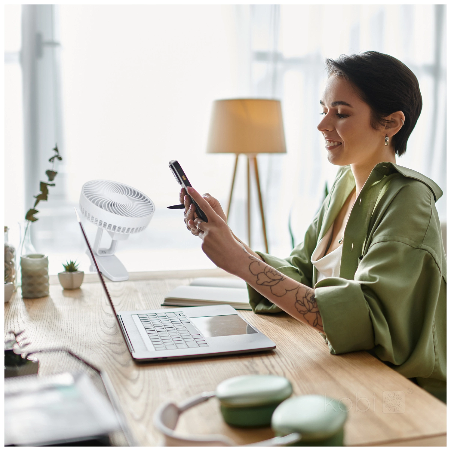 Lernen Sie den hochmodernen, tragbaren, wiederaufladbaren USB-C-Schreibtischventilator der Viento-Marke Windstar in schlichtem Weiß kennen. Mit einer Leistung von 4,9 Watt und einer Spannung von 3,7 Volt ist dieses äußerst praktische Gerät ideal für jedes Büro oder Zuhause und bietet angenehme Erfrischung an heißen Sommertagen. Dank seiner kompakten Bauweise und der Möglichkeit der freistehenden Montage lässt sich der Ventilator leicht verschieben und nach Bedarf positionieren. Ein praktischer Clip ermöglicht es, ihn dort zu befestigen, wo er am meisten gebraucht wird.