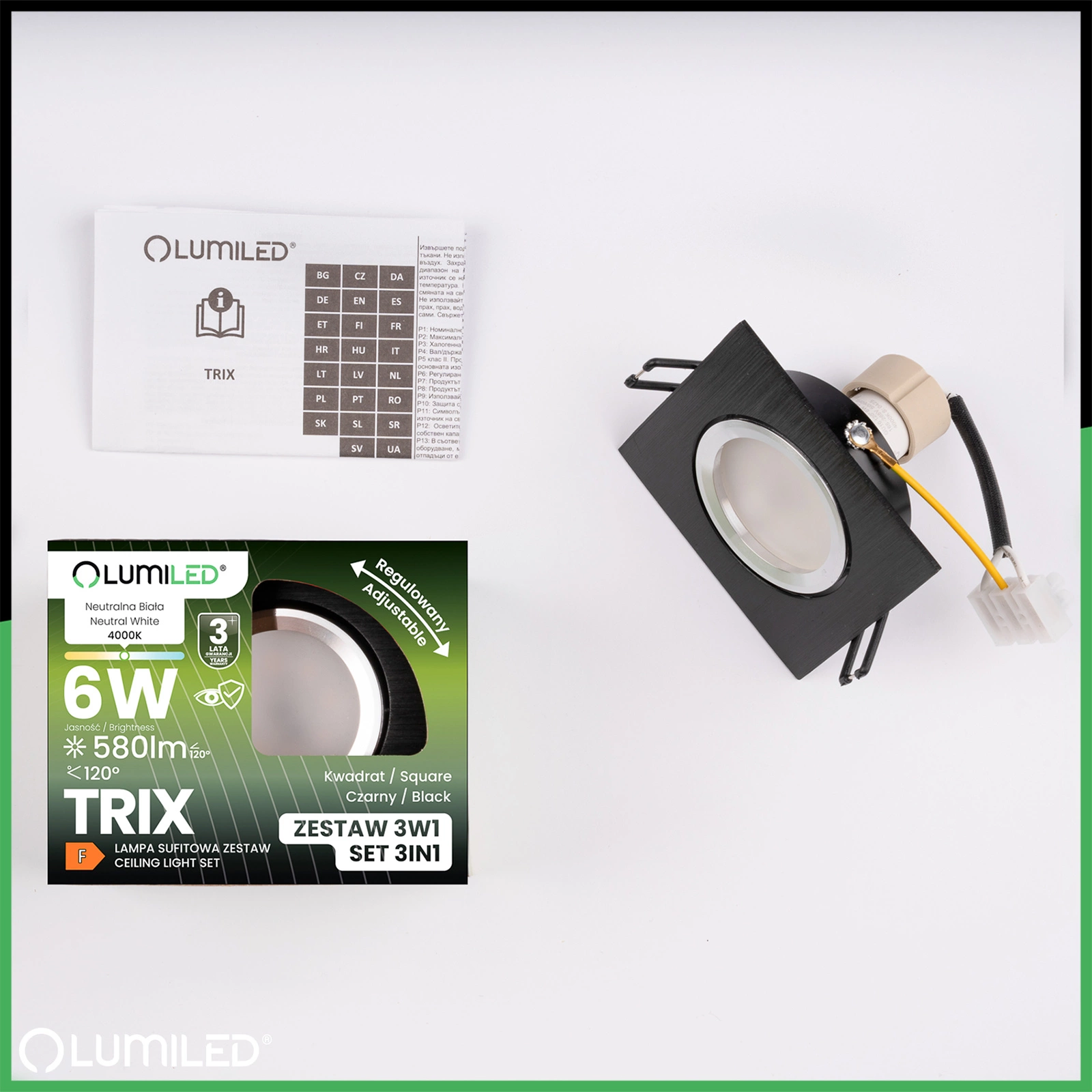 TRIX 3in1 GU10 6W 4000K Schwarz LUMILED quadratische bewegliche Halogen-Einbauleuchte