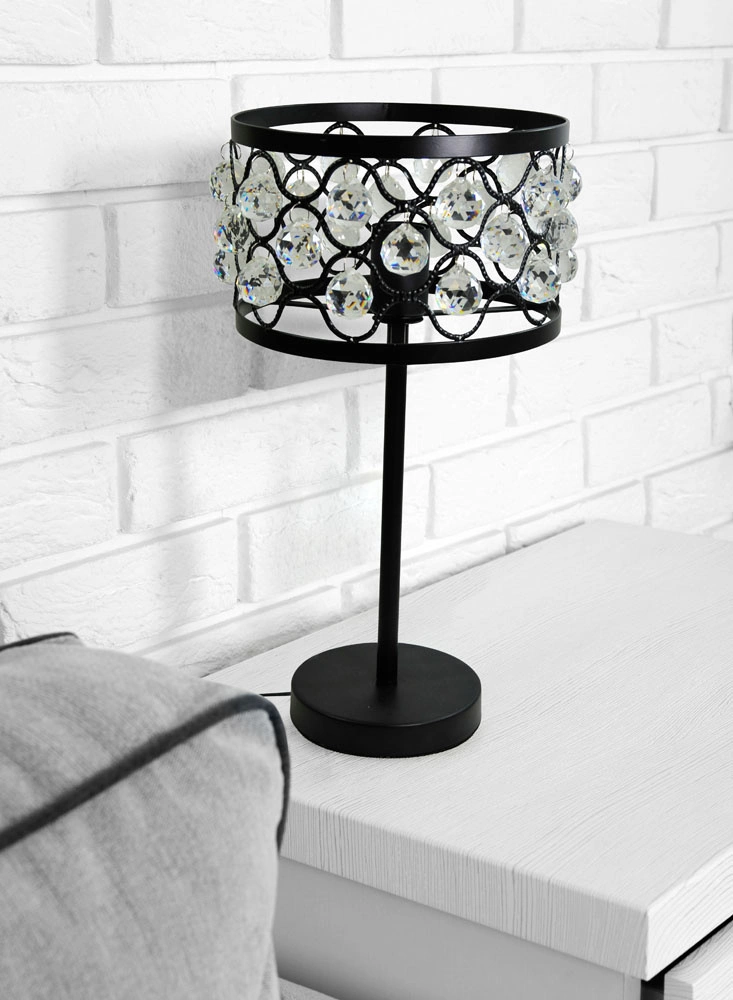 Die Stehtischleuchte aus der VEJLE-Serie hat eine äußerst dekorative, elegante Form. Seine schwarze Metallstruktur ist mit Glastropfen verziert. Es sieht in modernen Innenräumen mit schwarzen Details großartig aus. Es kann eine interessante Abwechslung zum strengen Interieur im Loft-Stil sein. Es passt auch in Arrangements, die vom Retro- und Glamour-Stil inspiriert sind. Es wurde mit viel Liebe zum Detail aus hochwertigem Stahl und wunderschön geschliffenem Glas gefertigt, das tagsüber wunderschön funkelt. Abends ermöglicht die Lampe einen außergewöhnlichen Lichtstreueffekt. Sie eignet sich vor allem im Schlafzimmer als Nachtlampe. Einen interessanten Effekt erzielen wir auch, wenn wir sie als zusätzliche Lichtquelle im Wohnzimmer platzieren und so eine gemütliche Atmosphäre schaffen, die zum Entspannen am Abend einlädt.