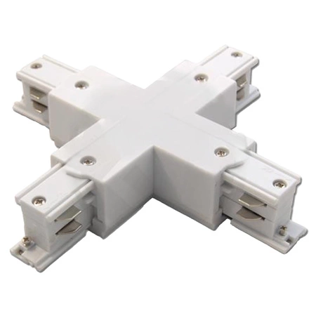 Der vorgestellte Vierfach-X-Schalter in Weiß ist ein Element der Schienenbeleuchtung. Es ermöglicht den Anschluss von Stromschienen an vier Seiten im Winkel von 90° . Mithilfe von Steckverbindern können Sie Ihr Schienensystem auf Schienenleuchten erweitern.