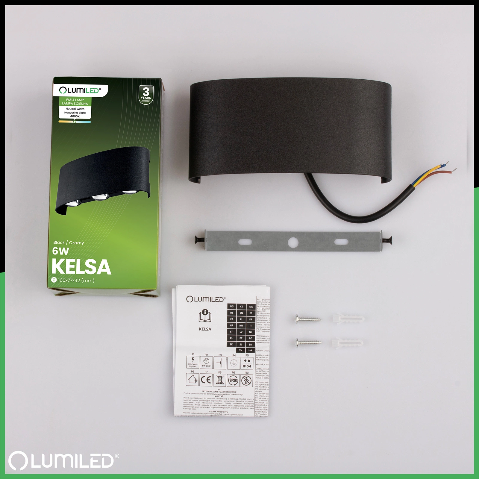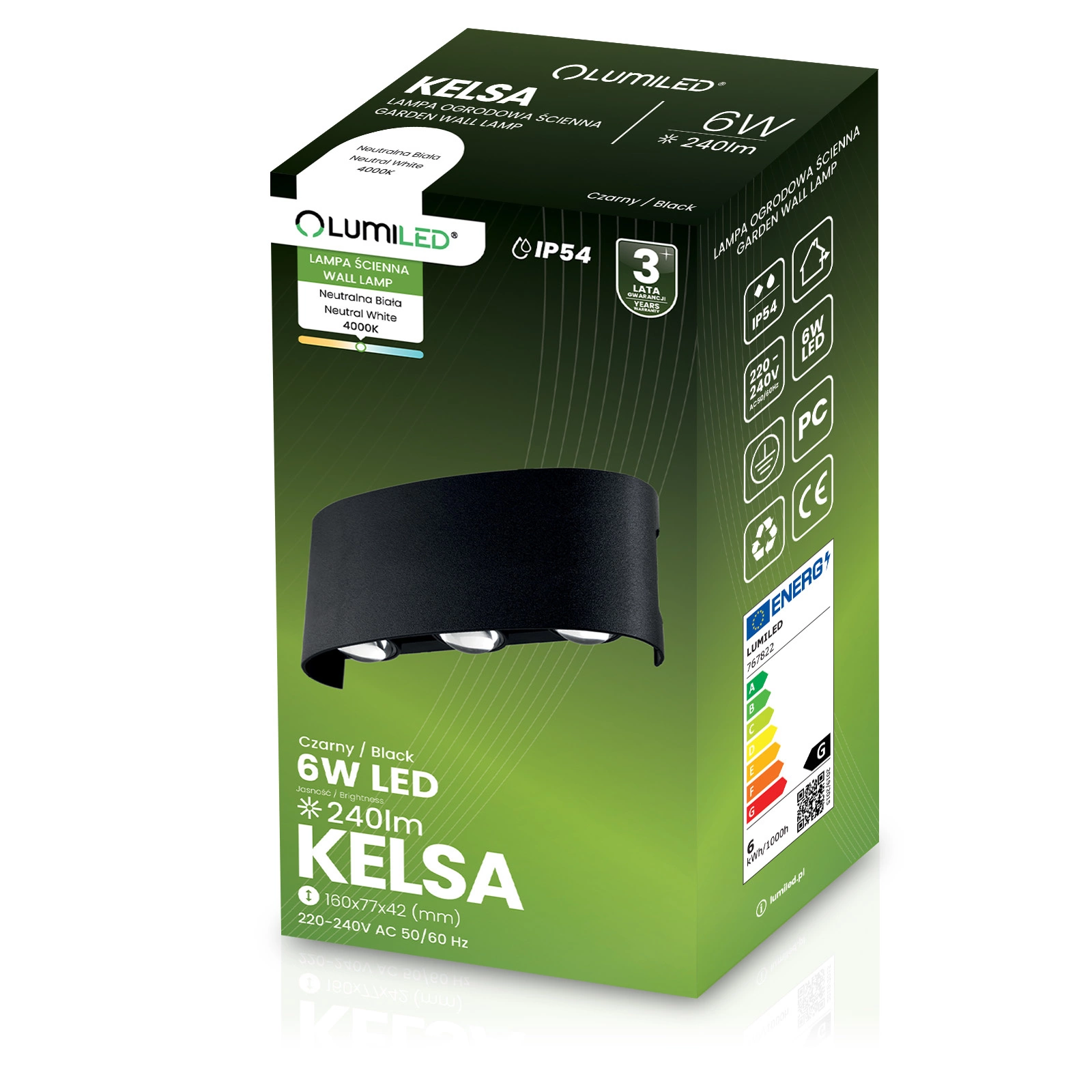 Die Wandleuchte ist mit einer eingebauten 6-W-LED-Lichtquelle ausgestattet. Sie strahlt Licht mit einer neutralen Farbe und einer Temperatur von 4000K aus.